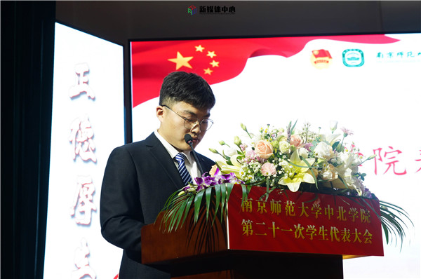 来自南京师范大学泰州学院学生会的方文轩同学作为兄弟院校代表上台发言。他对中北学院学生会工作取得的成绩表示肯定,期望与中北学院学生会一如既往地保持密切交流和联系,共同进步、共同成长,并衷心祝愿本次大会圆满成功。