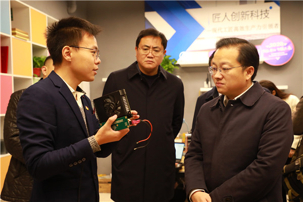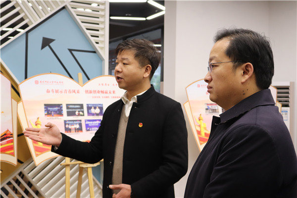 随后,司勇书记一行参观了中北学院大学生创业孵化基地。在基地,司勇书记现场了解到,自2019年以来中北学院依托孵化基地,先后开展了丹阳市青年创业大赛、新媒体创业大赛、三创文化节等系列大学生创新创业活动。通过比赛遴选了一批优秀创业项目入驻孵化基地进行培育。在今年的江苏省第十一届“挑战杯”大学生创业计划竞赛中入驻项目还荣获一金一铜的好成绩。目前,孵化基地不仅为创新创业团队提供免费的办公场地,同时还提供创业指导、政策咨询、金融服务、宣传推介等一系列服务,帮助创业孵化团队成长为具有竞争力的青创企业。