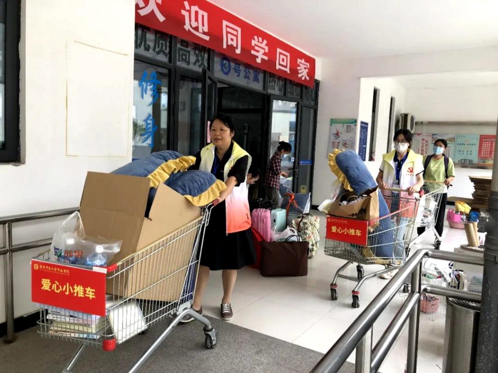 当好“家长”,上好爱生课。来自组织人事处的石中花老师,在学院招募志愿者时积极响应,第一时间报名。石老师争上一线,带动了组织人事处的唐邢晓雪、周健、刘旋、宋羽葭等一批年轻同志,他们积极主动,从早到晚,在公寓楼上楼下奔波,积极为学生打包箱子,搬运行李。