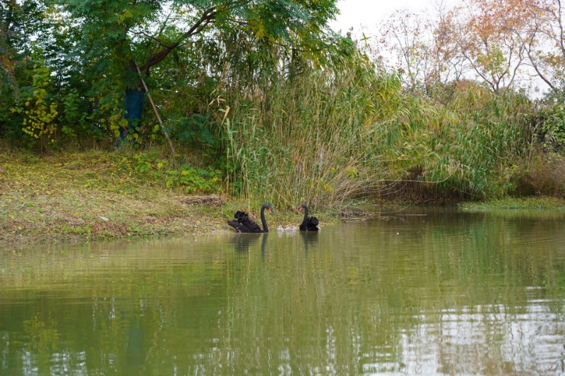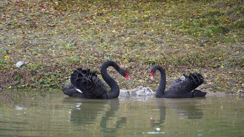 今年冬季龙湖的天鹅小宝宝似乎来得比以往都要早。初冬和煦的暖阳下,在黑天鹅妈妈和黑天鹅爸爸的精心呵护下,5只新生的天鹅宝宝亦步亦趋地跟着爸爸和妈妈,两只黑溜溜的眼睛新奇地打量着这个世界。黑天鹅爸爸和黑天鹅妈妈也十分有爱地把天鹅宝宝守护在中间,一个在前面领路,一个在后面守卫。5只可爱的小天鹅宝宝有的自己在水里嬉戏,有的站在妈妈的背上,小心翼翼地观察四周。它们的出生,让冬季有些落寞的龙湖再次生动了起来,也给中北学院同学们的校园生活增添了乐趣。