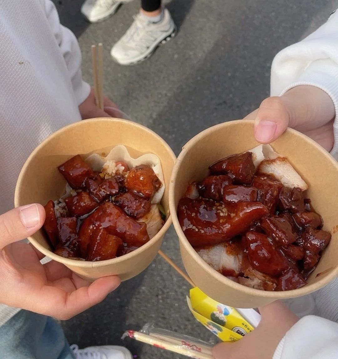 吃过了甜品,还要尝尝烤肉,手里已经捧着卤肉的盒子,还要排队再去领一份丸子。美味众多,好好品尝,美食节的活动就是美吃美喝美尝,大饱口福,齿颊生香。