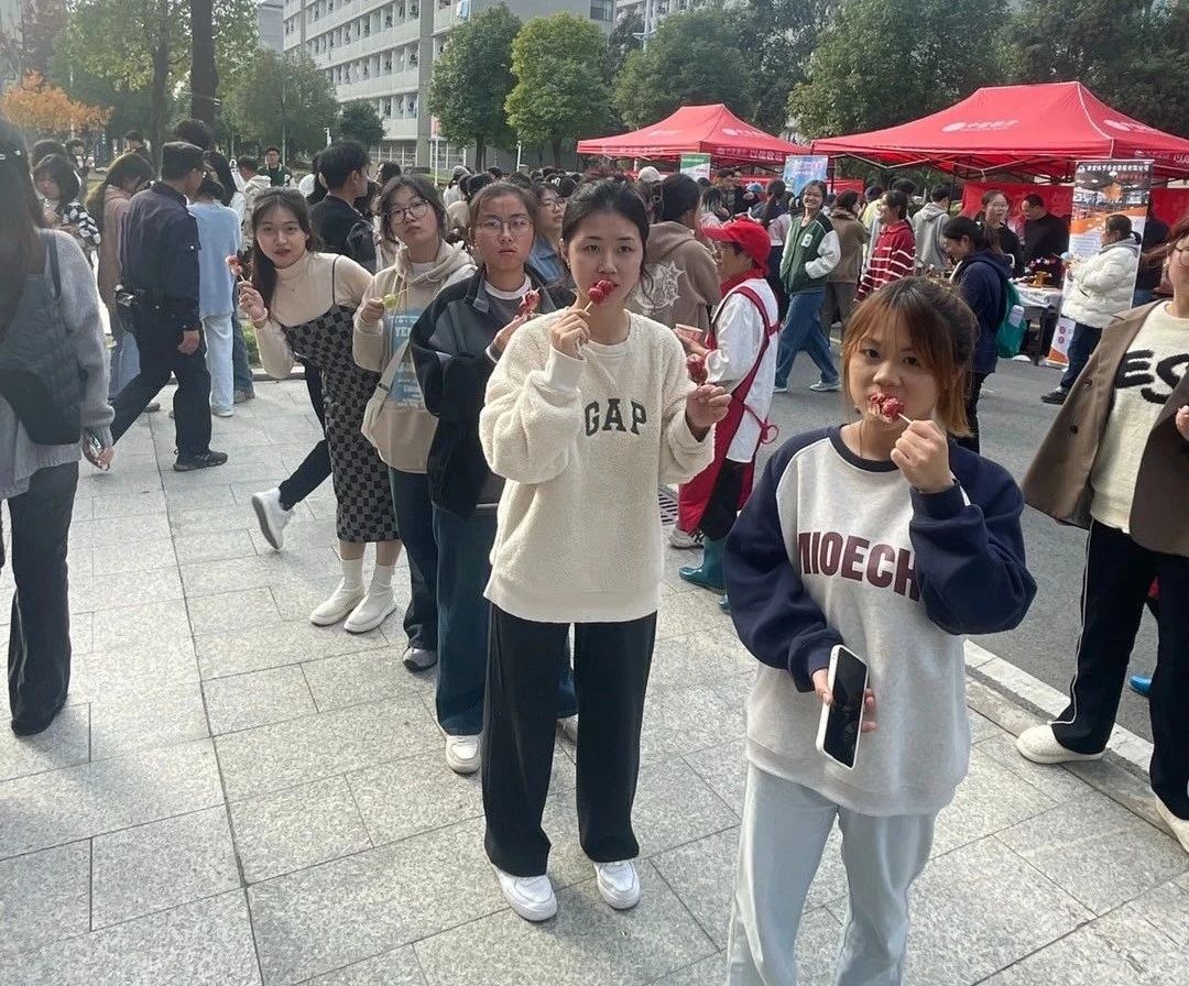糖葫芦跟前,吸引了一群年轻的中北女大学生,她们不但吃起了糖葫芦,还举起糖葫芦,列队而行,仿佛穿越到了少儿时代。