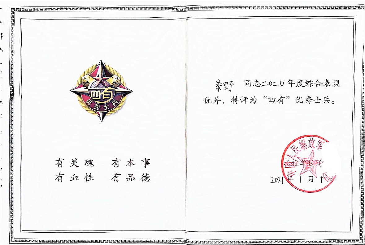 “在未来的道路上,我将继续发扬军人的优良传统和作风,以更加饱满的热情和更加坚定的信念,书写属于我自己的精彩篇章。”秦野自信地表示。