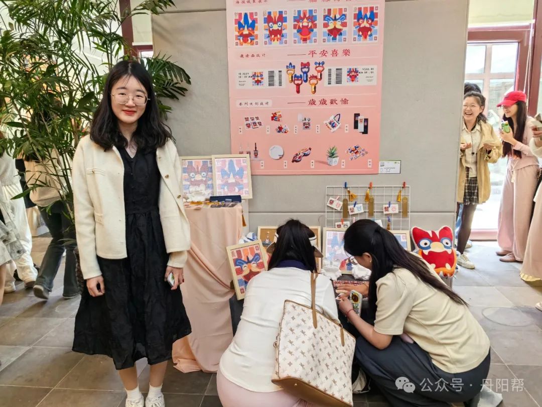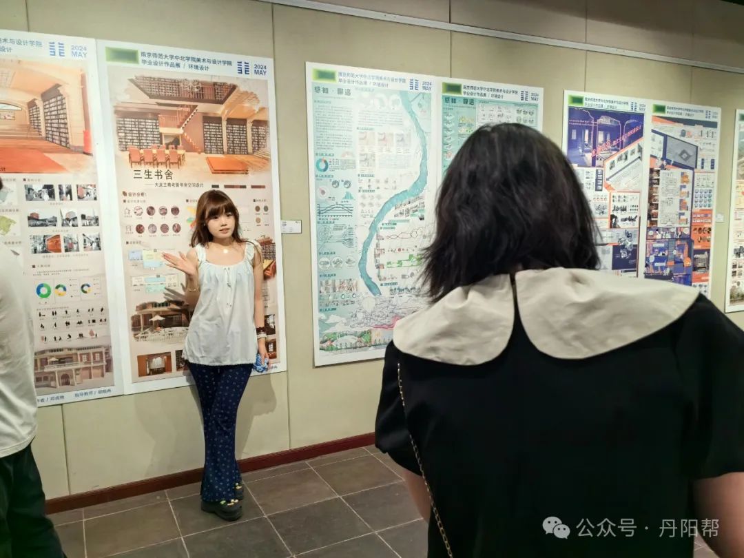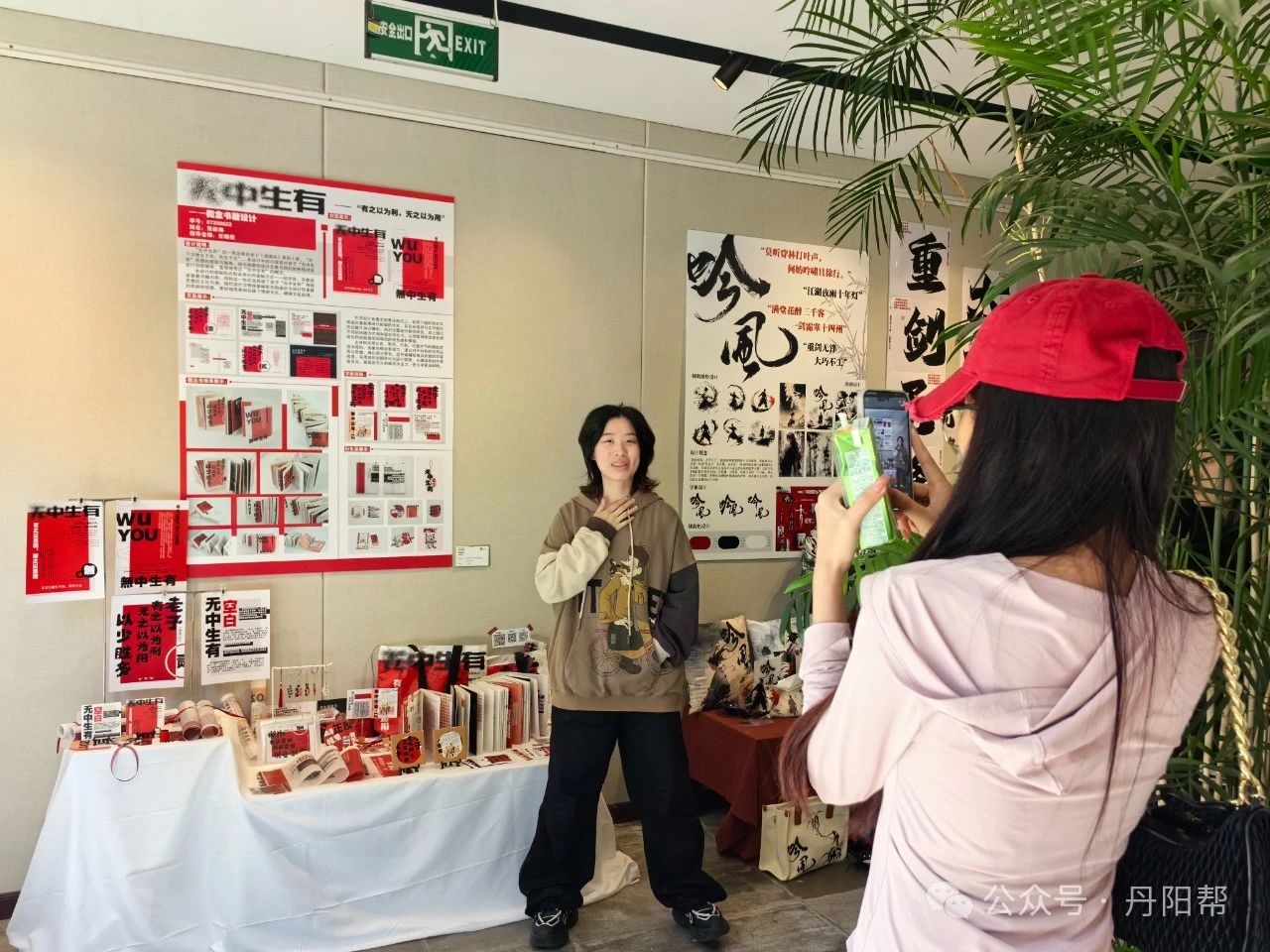 在展览现场很多学生在自己的毕业作品前打卡留念。