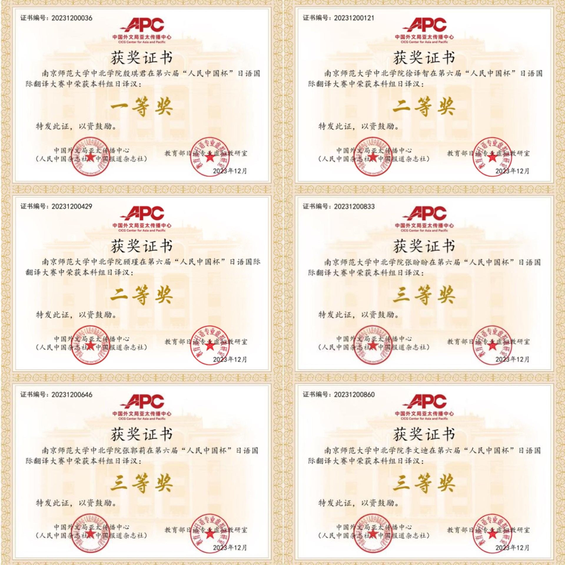 教学团队将平时千锤百炼的功夫运用于大赛,学院成为获奖专业户便水到渠成。2023年江苏省高校微课教学比赛,外国语学院王香玲教师的微课与田蒙可教师的微课分别荣获三等奖;第三十五届韩素音国际翻译大赛,外国语学院2021级翻译专业樊玉莲获英译汉组二等奖,2022级英语专业董潞瑶获英译汉组优秀奖;第六届“人民中国杯”日语国际翻译大赛,外国语学院6名学子获奖,其中一等奖1项、二等奖2项、三等奖3项,中北学院获评优秀组织奖,3位老师获评优秀指导教师奖,获奖等次和获奖总数位居参赛学校前列。