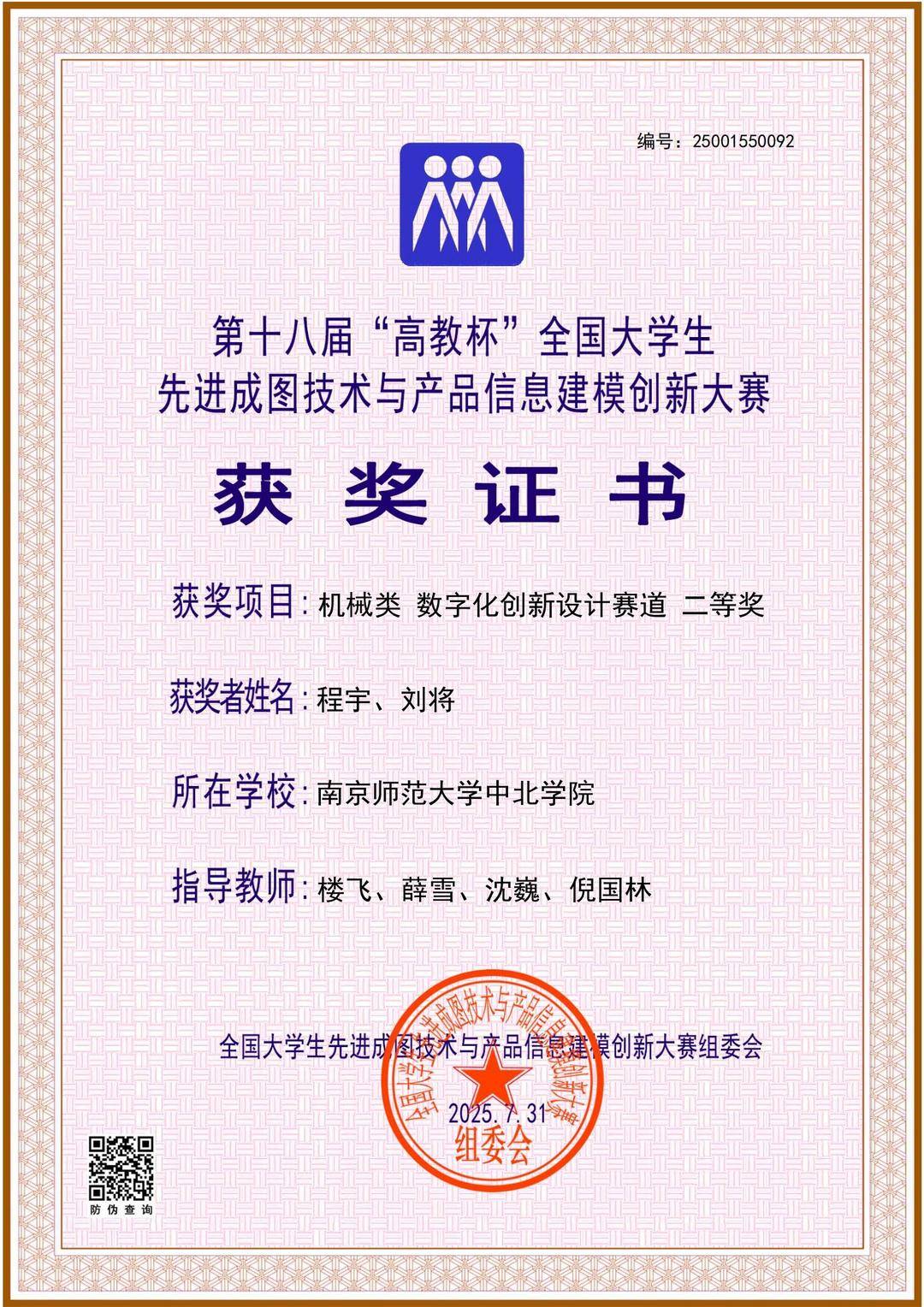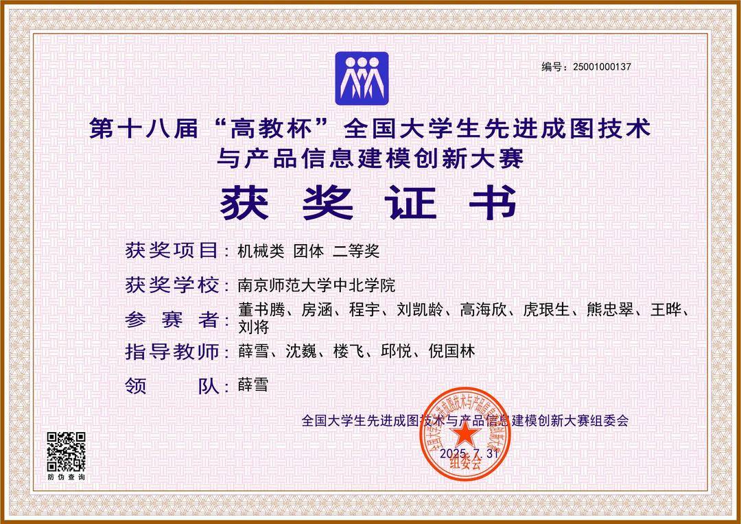 扬子晚报网8月31日讯(记者 姜天圣)2025年7月25日至28日,第十八届“高教杯”全国大学生先进成图技术与产品信息建模创新大赛全国总决赛在太原理工大学顺利举办。本届赛事竞争尤为激烈,总获奖率较往年大幅降低,南师大中北学院参赛团队凭借深厚的专业积淀与稳定的临场发挥逆势突围,交出亮眼答卷。具体成绩如下:荣获机械类团体二等奖;成图赛道摘得一等奖1项、二等奖2项、三等奖4项;创新设计赛道斩获二等奖1项;增材制造赛道拿下三等奖1项;优秀指导教师二等奖5项;电子类成图赛道三等奖1项。