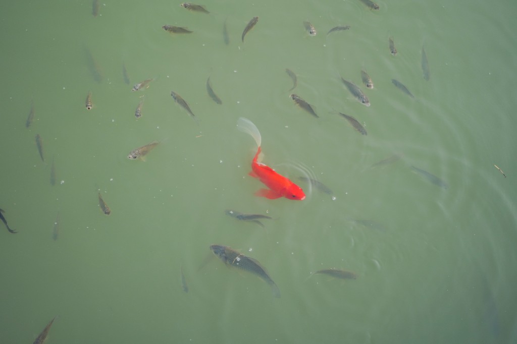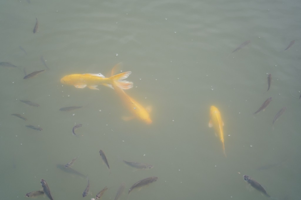 不仅如此,87亩水面的龙湖里还放养着大大小小的各种鱼儿。从2019年夏天开始,中北学院在龙湖投放了草鱼、青鱼、鲢鱼、鳙鱼、鲫鱼鱼苗,这些鱼儿在野生的环境里生长,至今已有三年的时间。一般的鱼已经长到两三斤,大鱼长到了五六斤。平时小个的鲫鱼,大个的草鱼成群结队地在湖面巡游,和湖中游弋的天鹅阵列一样,成为师生环湖行走时龙湖里的风景。