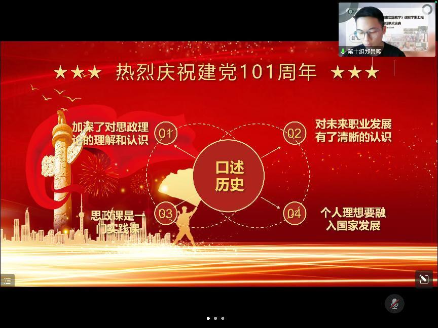 通过初赛的角逐与筛选,本次共有10个小组进入到决赛阶段,既有抗战老兵、维和士兵、乡村振兴等四史主题,也有非遗传承人、法治行业人等与地方文化和专业发展等相关主题。由于本学期疫情防控要求的变化,同学们在口述史实践课程中常常遇到新的难题,但大家迎难而上,在尝试多种办法无法完成最初选题的情况下,才会调整选题、更换对象。在疫情封校情况下,将不可能变为可能,通过与受访者的线上访谈,让口述史活起来,为口述史赋予了新的生命,注入了新的活力。通过口述史学生们深化了对先行思想政治理论课程内容的理解,通过对身边“普通但不平凡”的人物的口述访谈,理解改革开放给人民的社会生活带来的改变,理解脱贫攻坚和乡村振兴方针下国家的变化,理解将个人命运与时代命运相结合的重要性。从非物质文化遗产传承人身上学习工匠精神、终身学习和改革创新精神,从军人身上学习百折不挠、保家卫国和视死如归的奉献精神。这都是这门课除了口述史这项技能以外,学生们可以得到的思想政治教育。