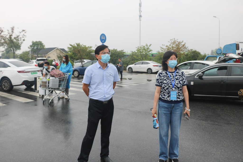 一大早,李莉等院领导就出现在学院南大门西入口处,他们观察老生进校流程,询问值班教师学生报到情况,查看疫情留观点。随后他们来到北大门入口处,这里道路宽旷,停车方便,老生返校接待工作按部就班,井然有序。