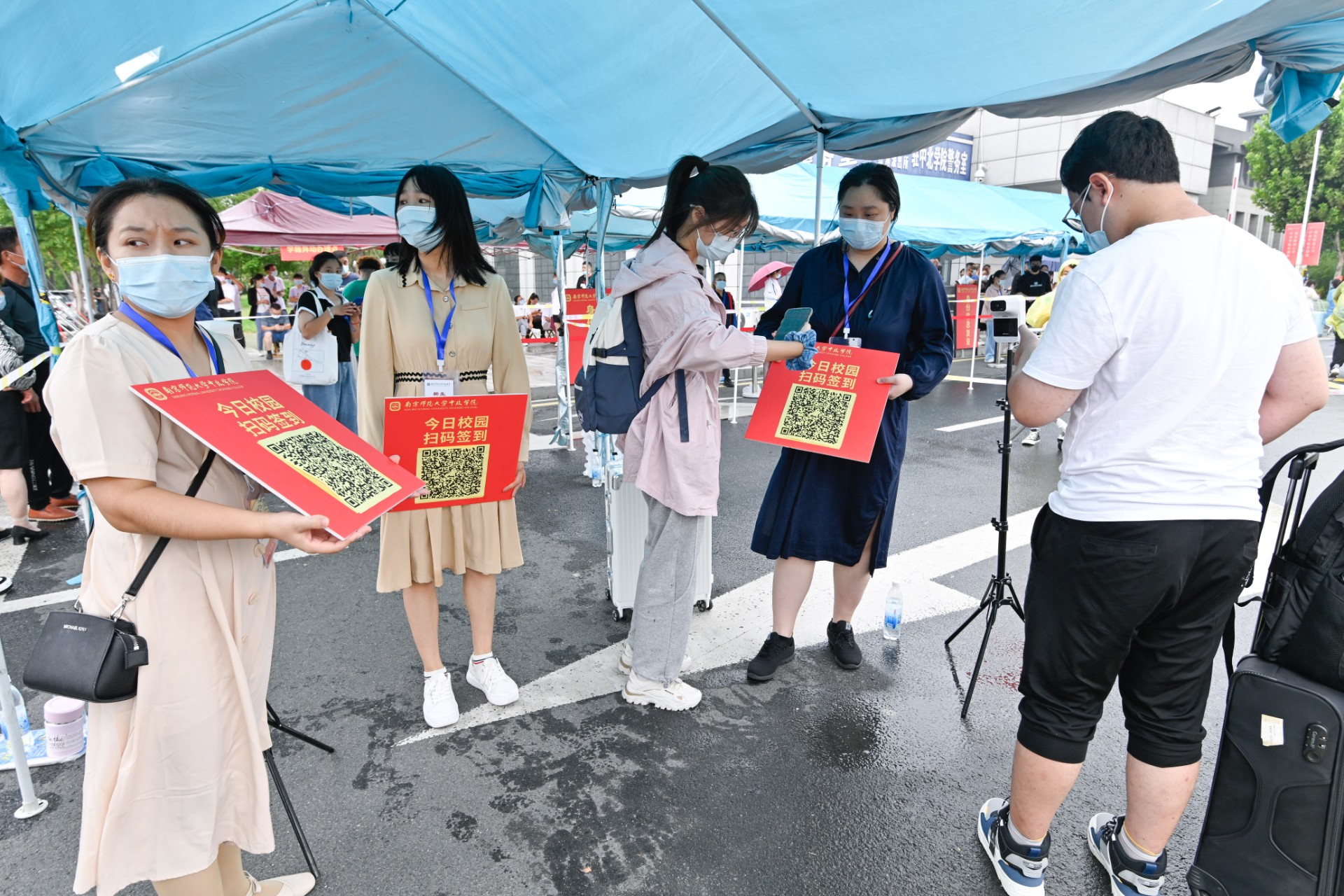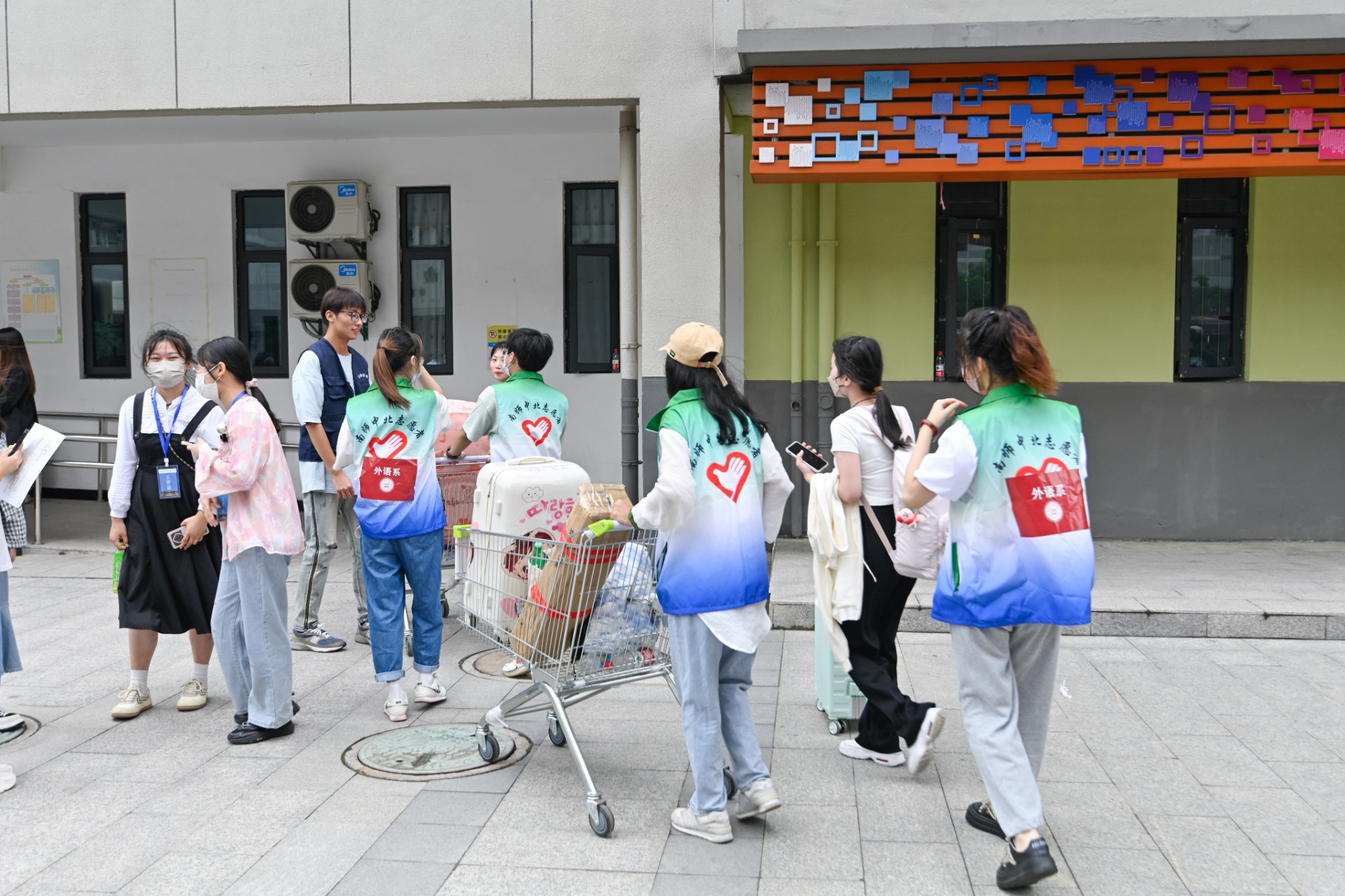 迎新当日,我院派遣车辆,组织老师在丹阳火车站、高铁北站、丹阳汽车站、丹阳汽车东站接待新生。在学院门口,实行自驾车辆“即停即走”、“一对一”精准接待服务。新生进校后,由学生志愿者帮助新生搬运行李,学院配备150辆小推车,方便了新生入学的行李搬运。虽然天空下着毛毛细雨,但是志愿者身穿雨衣,一趟趟地往返于学生公寓与校门口,展现了我院学子不畏困难、团结友爱的精神风貌。同时,我院在校园各路口设置了导线标识,帮助同学分辨公寓方向、系科报到处、校园卡办理处以及缴费地点。学院还在南门门口专门为远道而来的家长们准备了家长休息区,在休息区配有饮用水和座椅,让家长感受到了学校对于新生和家长的关怀。