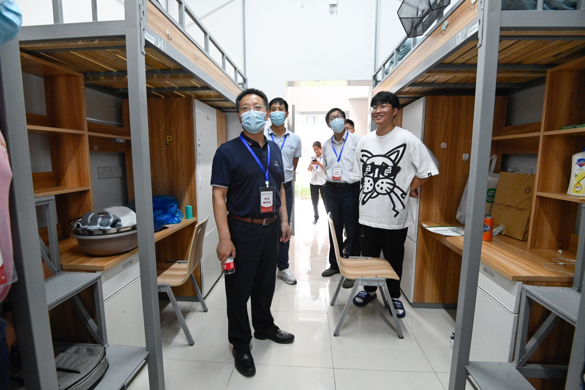 在学生公寓门口,张连红一行慰问了参加新生接待的老师和学生志愿者,对他们在迎新中的辛苦付出表示感谢。