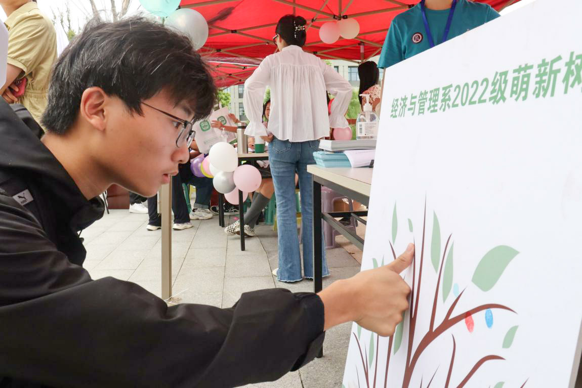 经济与管理系在报到点设立了萌新树,大家可以按下自己的手印,寓意着22级新生将与经管系共同成长。