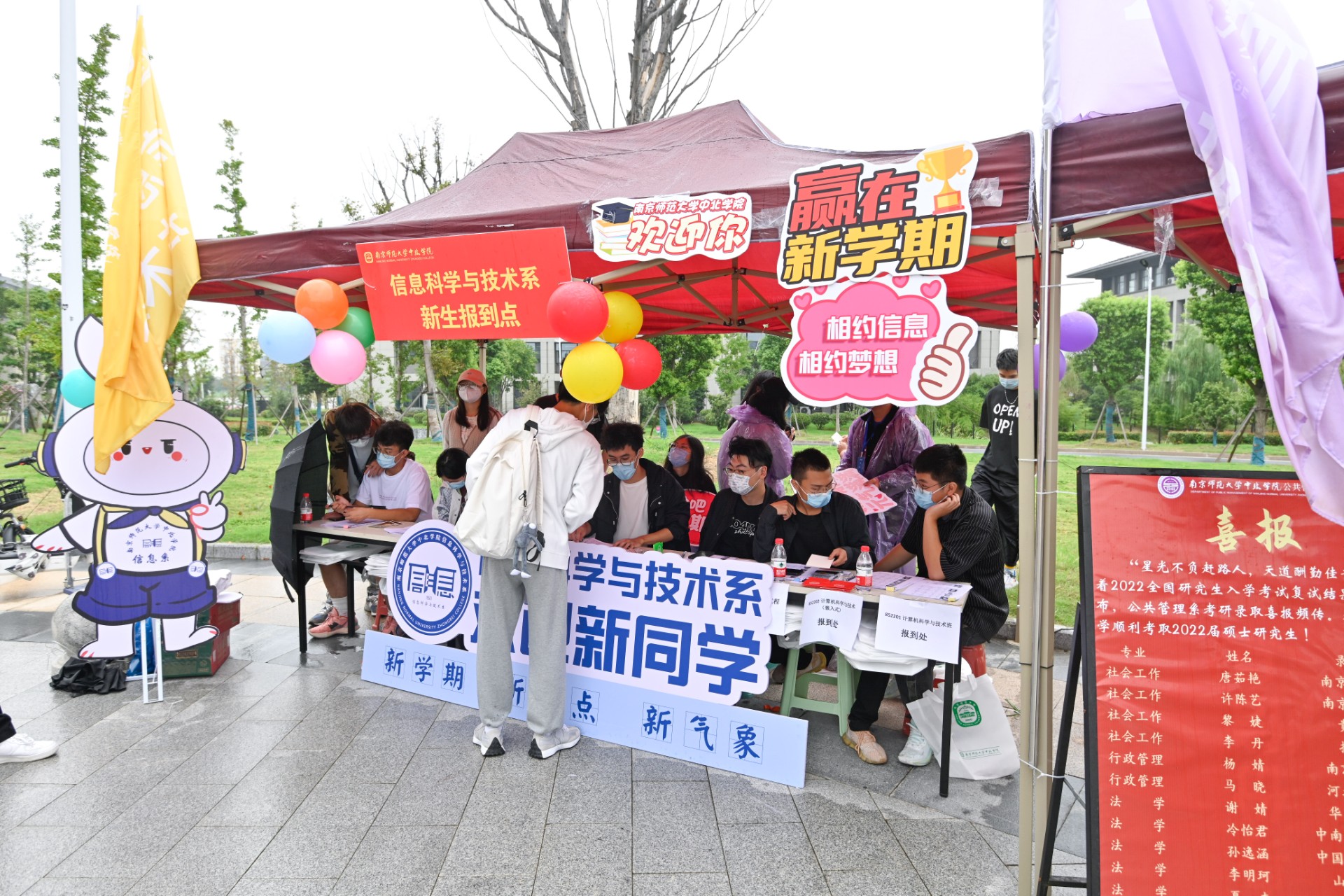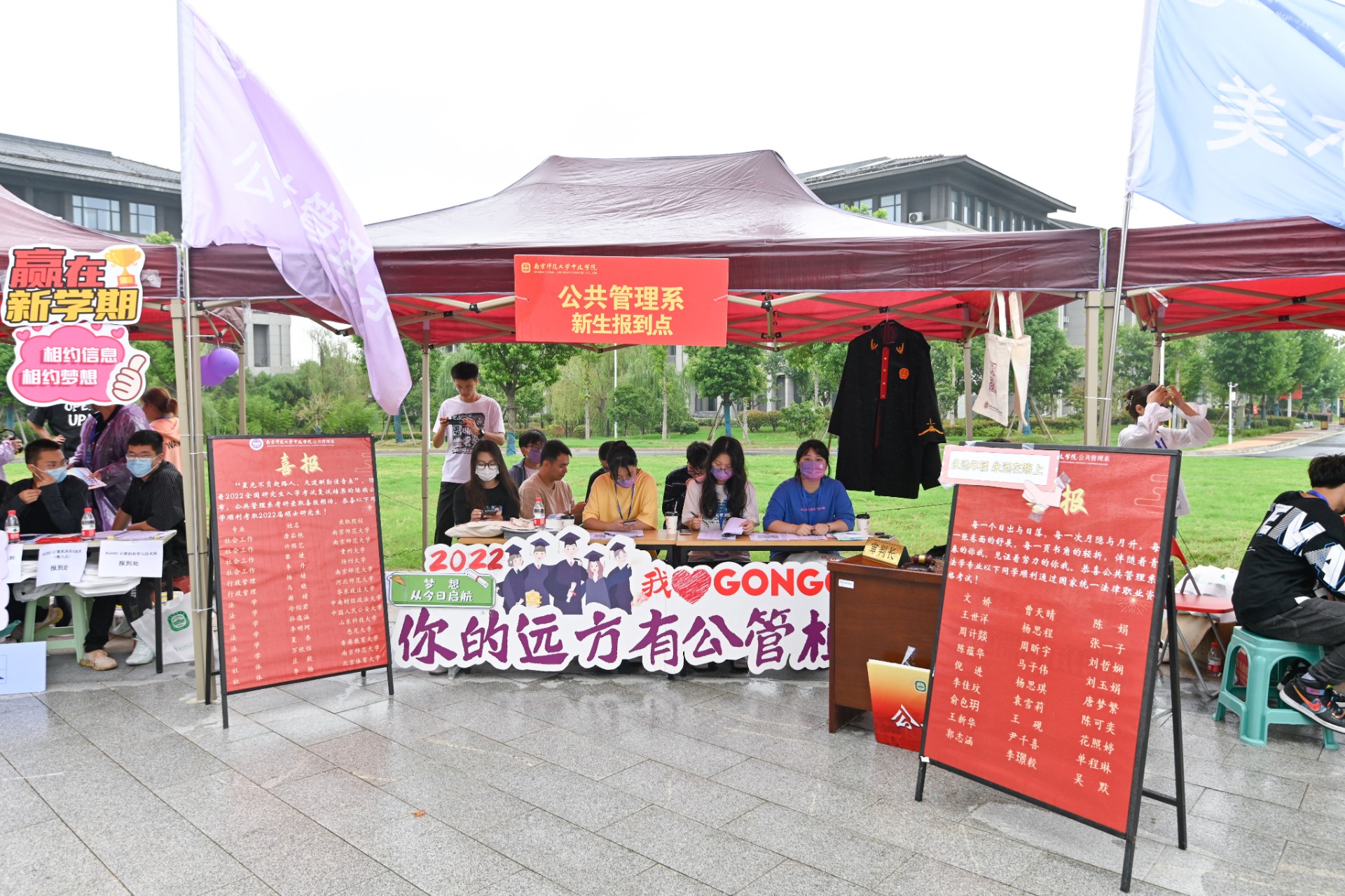 公管系新生报到点内设置审判长席、法袍、公管系特色标语等系科特色装饰,点内志愿者负责核对新生信息、帮助同学签到、询问新生学费缴纳情况以及助学贷款相关事宜并赠送新生礼物。