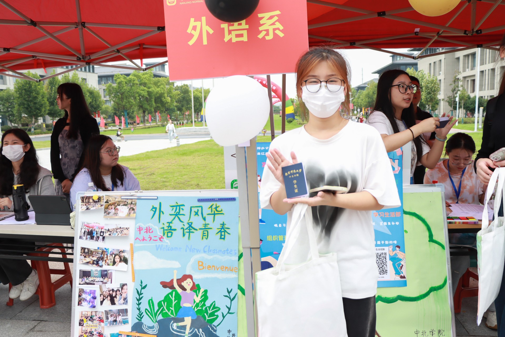 工学系学长身穿兔子和小熊的玩偶服,憨态可掬,热情地与新生合影,并且准备了许愿树,每位新生都可以在小卡片上写下自己的开学期望,挂在树上。