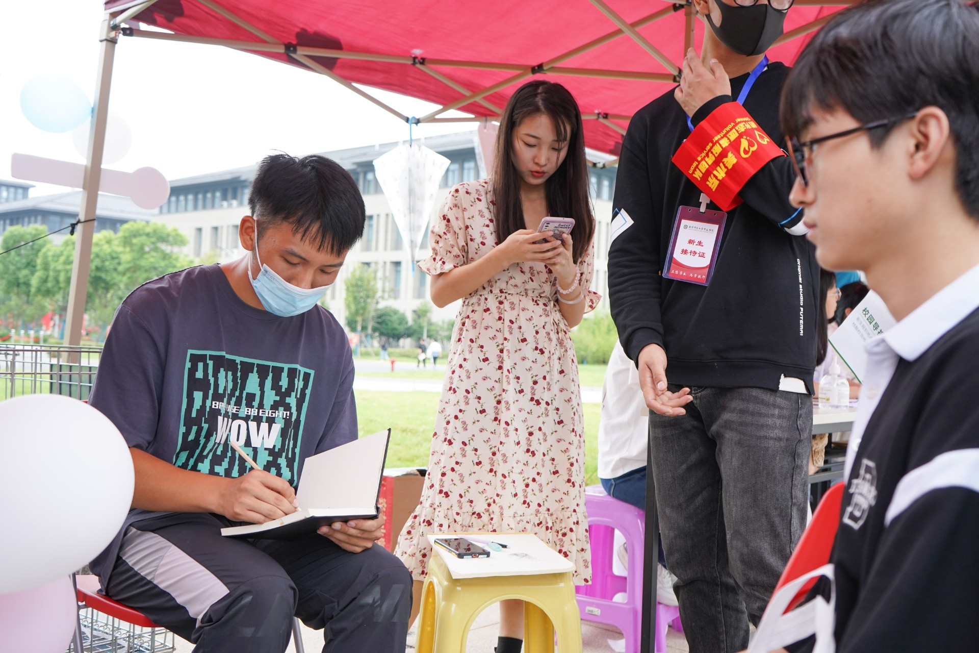 美术系贴心地为新生提供了小风扇,同时学长学姐现场给新生画人物速写,展示专业特色;