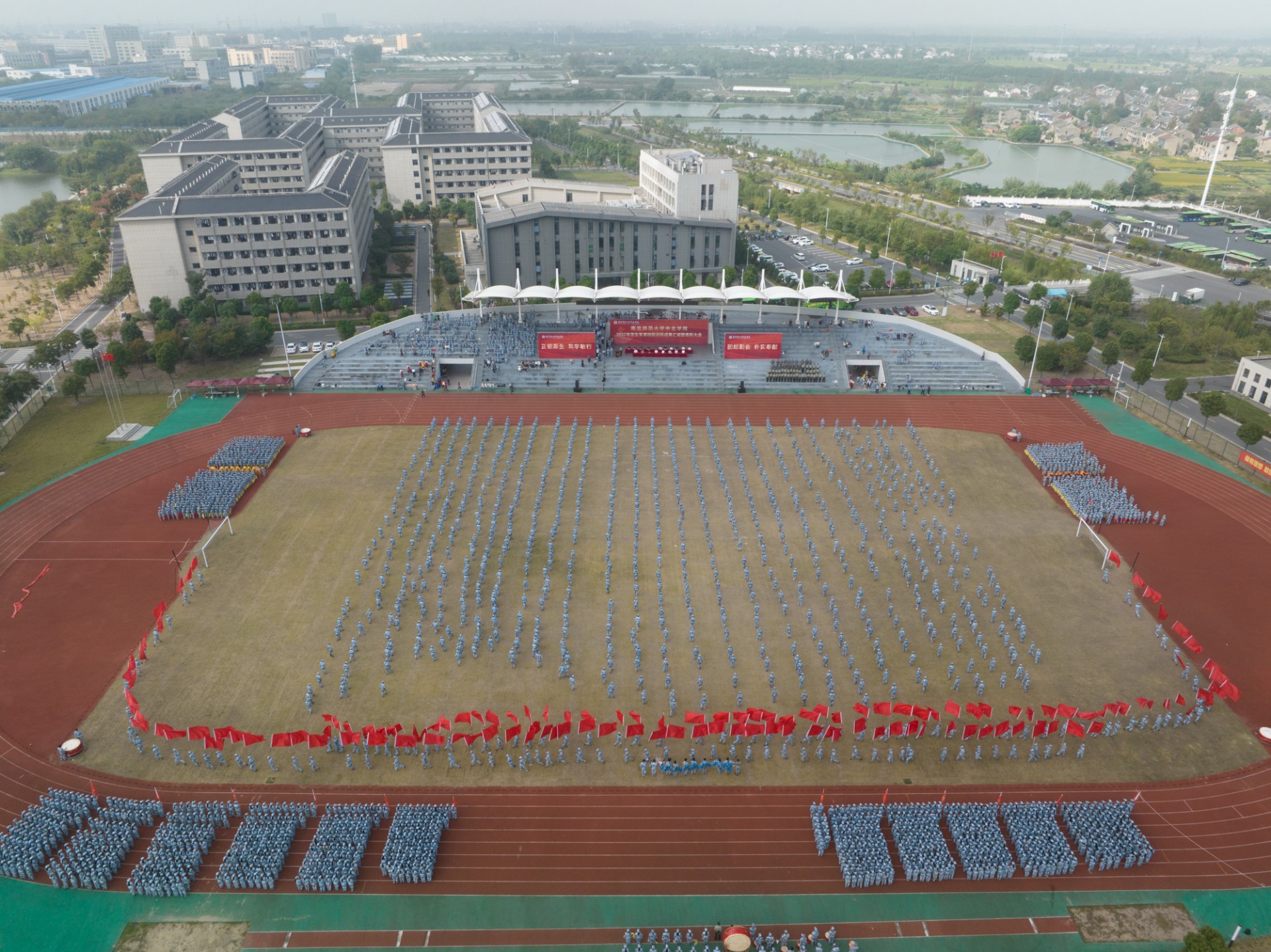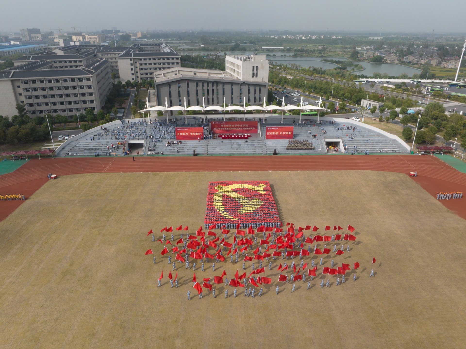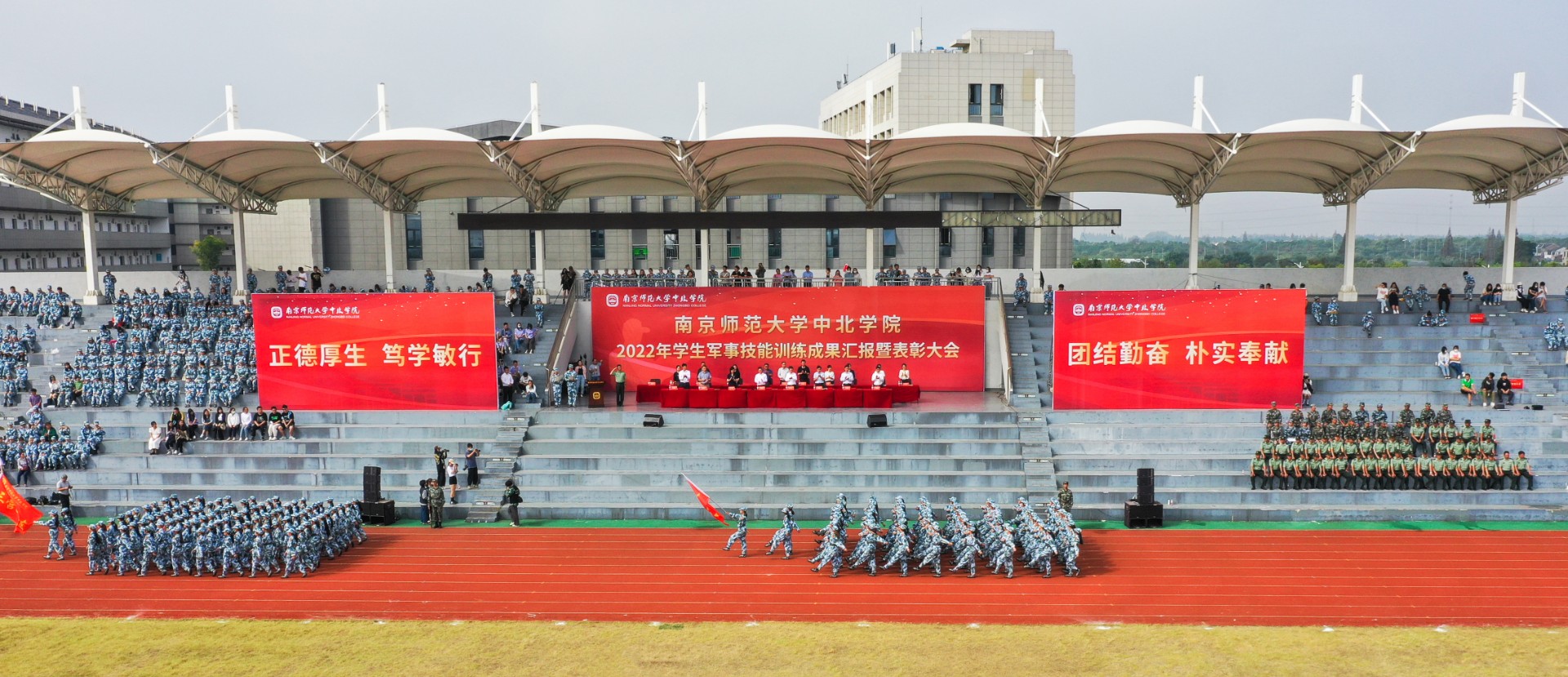 9月30日上午,ky.com2022年学生军事技能训练成果汇报暨表彰大会在北苑田径场隆重举行。南京师范大学党委常委、副校长,ky.com理事长、院长张连红、常务副院长常青、党委书记李莉、副书记冷开振、副院长张进明、夏宏全、钟文辉、纪委书记刘太明等学院领导、相关职能部门领导、各系科党总支副书记、全体带训教官、带训教师,参训的3600名学生参加大会。