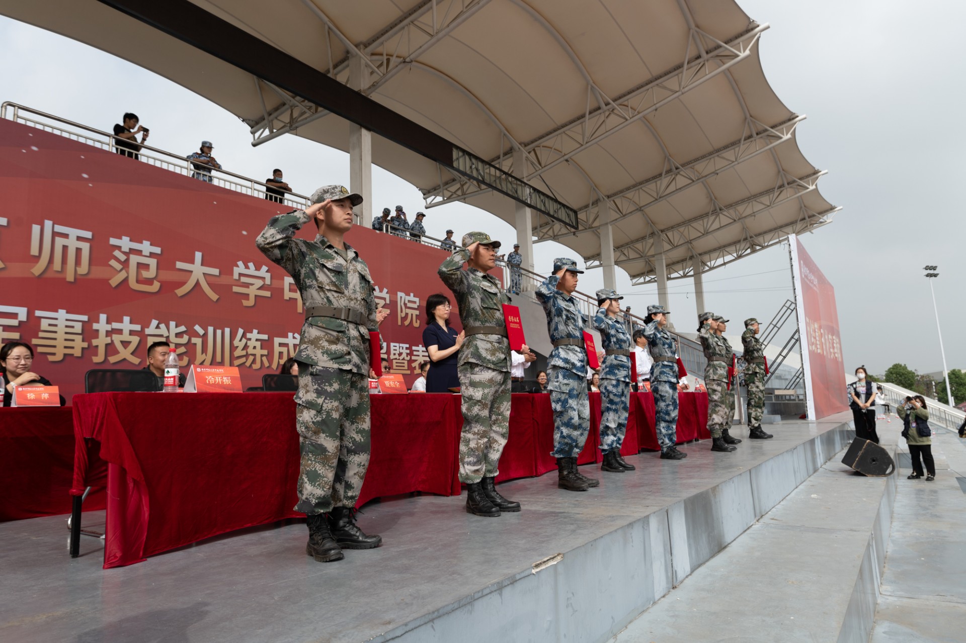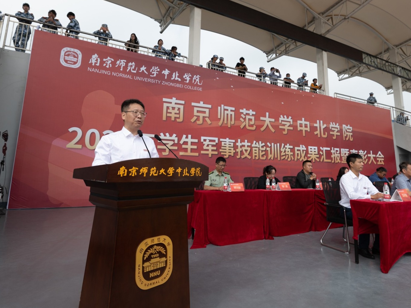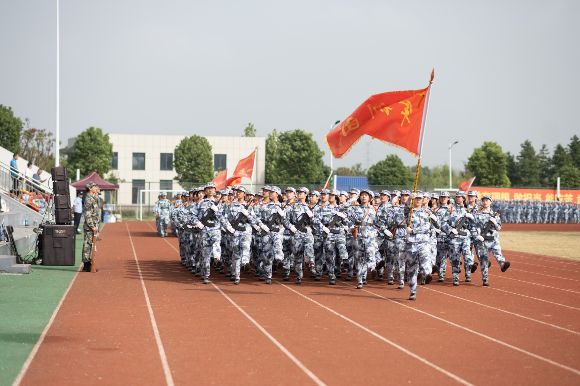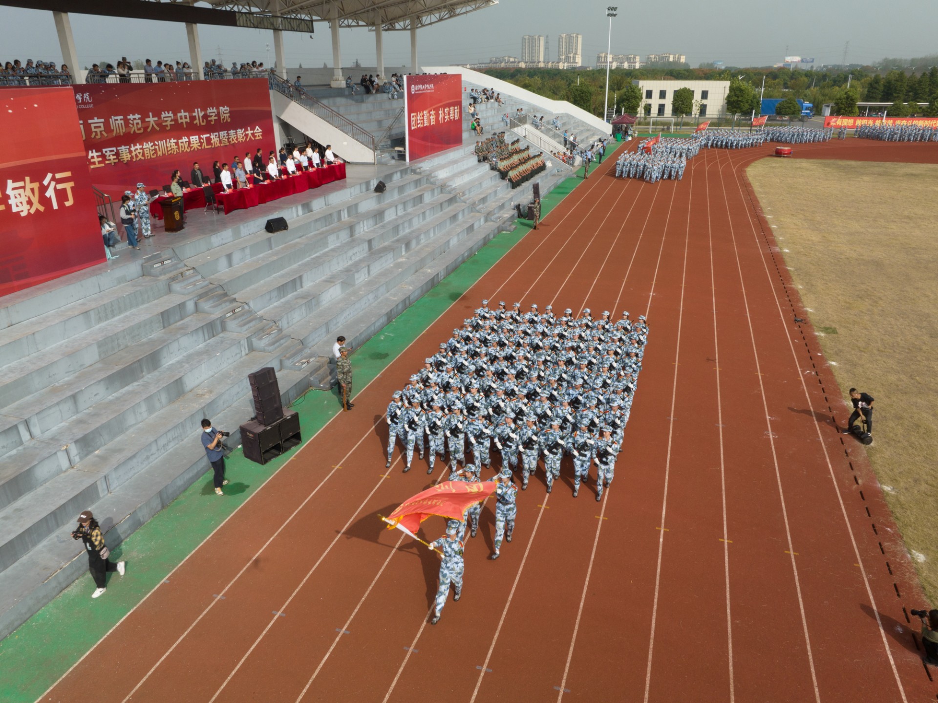 9月30日上午,ky.com2022年学生军事技能训练成果汇报暨表彰大会在北苑田径场隆重举行。南京师范大学党委常委、副校长,ky.com理事长、院长张连红、常务副院长常青、党委书记李莉、副书记冷开振、副院长张进明、夏宏全、钟文辉、纪委书记刘太明等学院领导、相关职能部门领导、各系科党总支副书记、全体带训教官、带训教师,参训的3600名学生参加大会。
