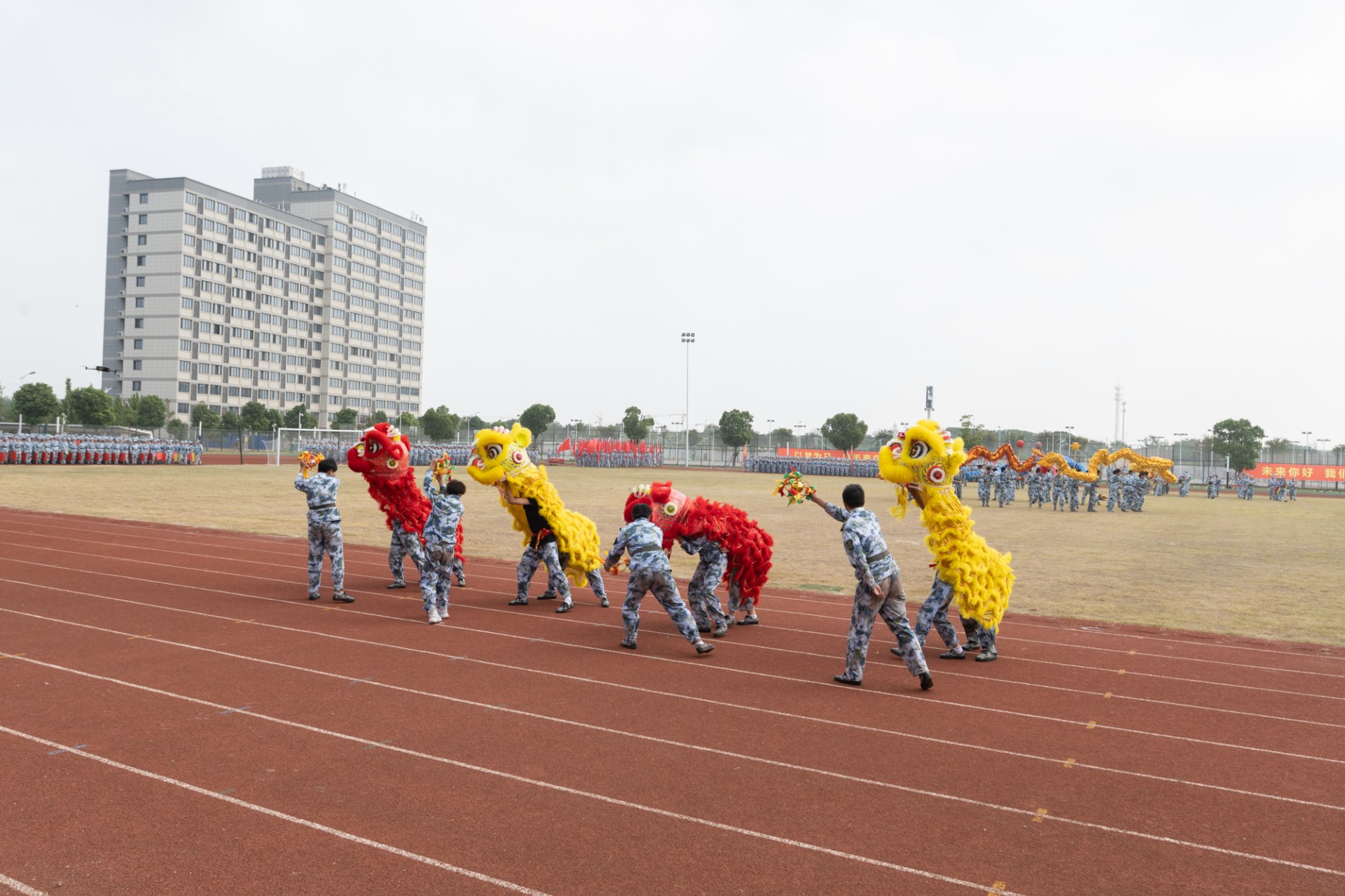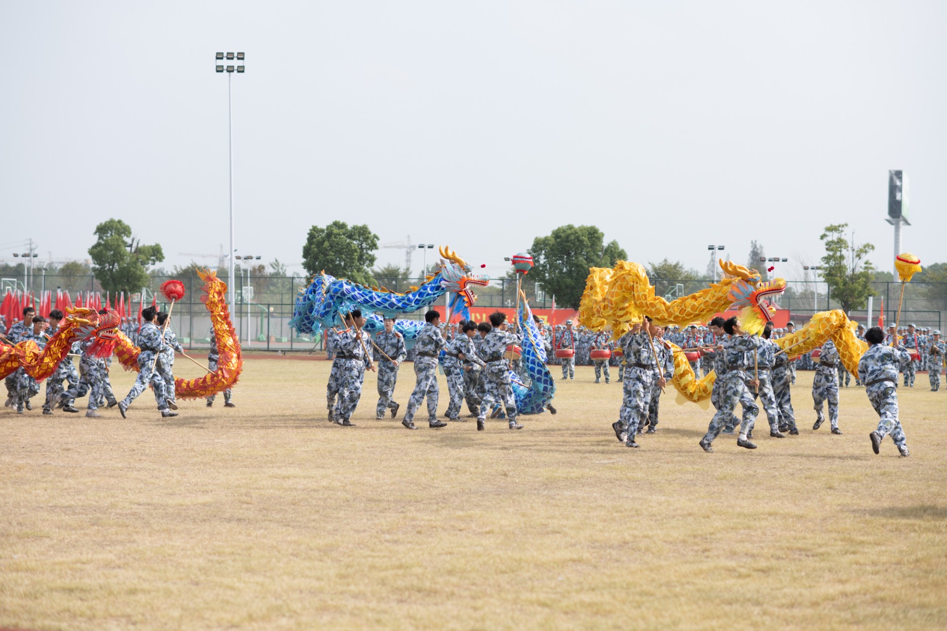 千名大学生在巨阵中快速翻动头顶的方块,呈现出青春告白的一行行大字。永远跟党走,青春为祖国燃烧,听从祖国召唤。军体拳出拳迅速,踢腿有力。弓步冲拳、马步横打,动作连贯,行云流水,气吞山河!舞龙舞狮,威风凛凛。一条条锦色长龙、一只只灵动雄狮在操场上翻腾起舞,喧天的锣鼓、舞动的龙狮展现了不屈不挠、勇于拼搏的精神风貌。