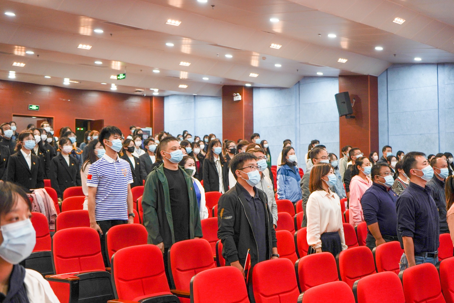 主会场内师生代表起立唱国歌