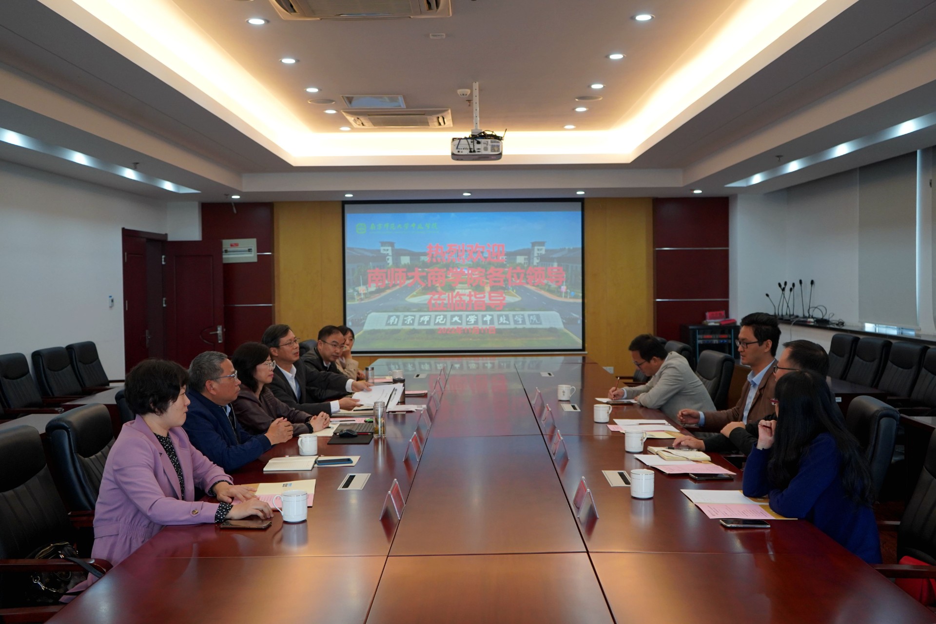 李莉介绍了学院建设发展情况,表达了在母体学校南师大支持下加快师资力量建设、专业建设和管理体系建设的迫切愿望。钟文辉围绕一流专业一流课程建设希望依托母体学校,通过与南师大商学院的专业合作共建,获得专业建设的扶持,专业导师的加持,年轻教师成长的引领。