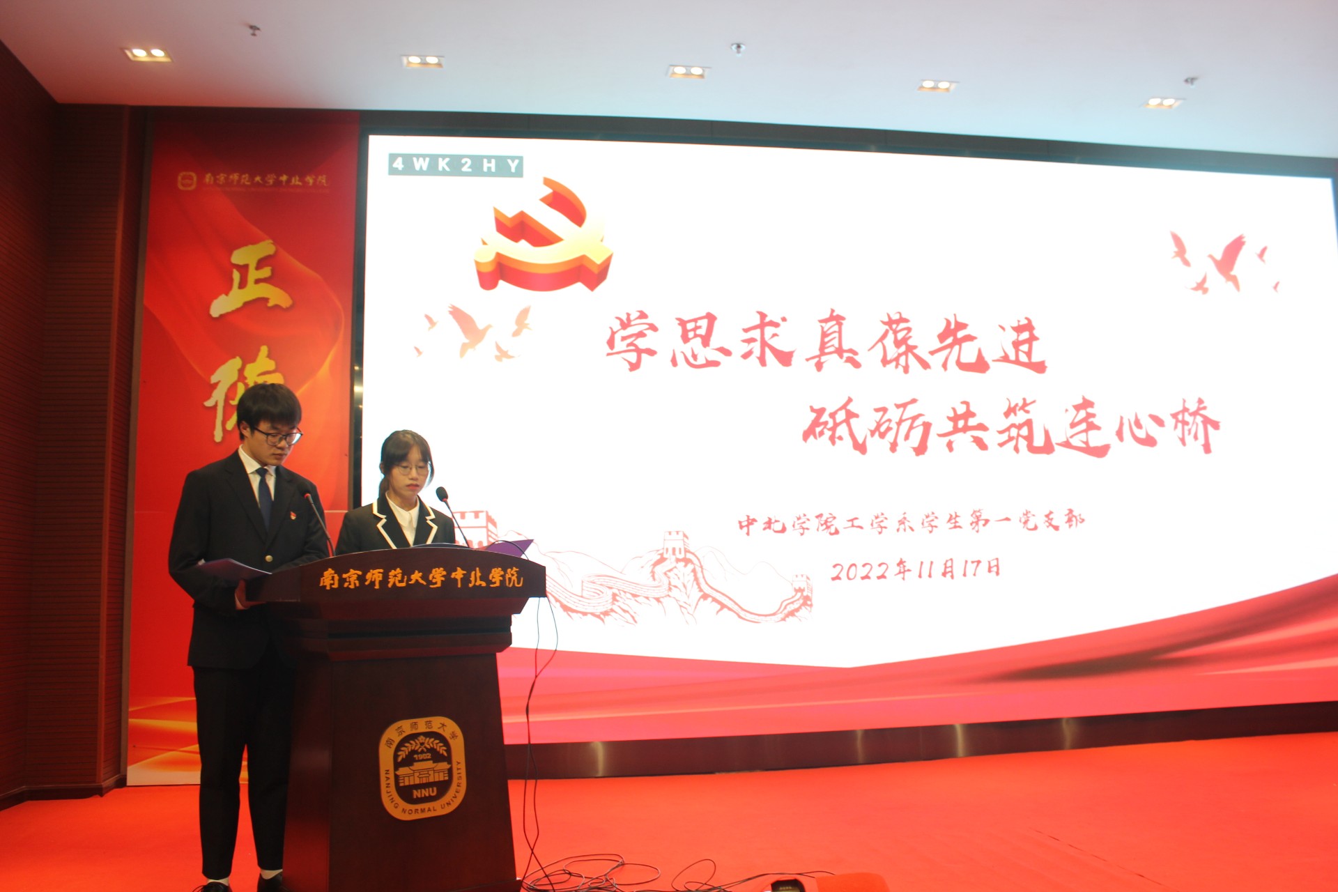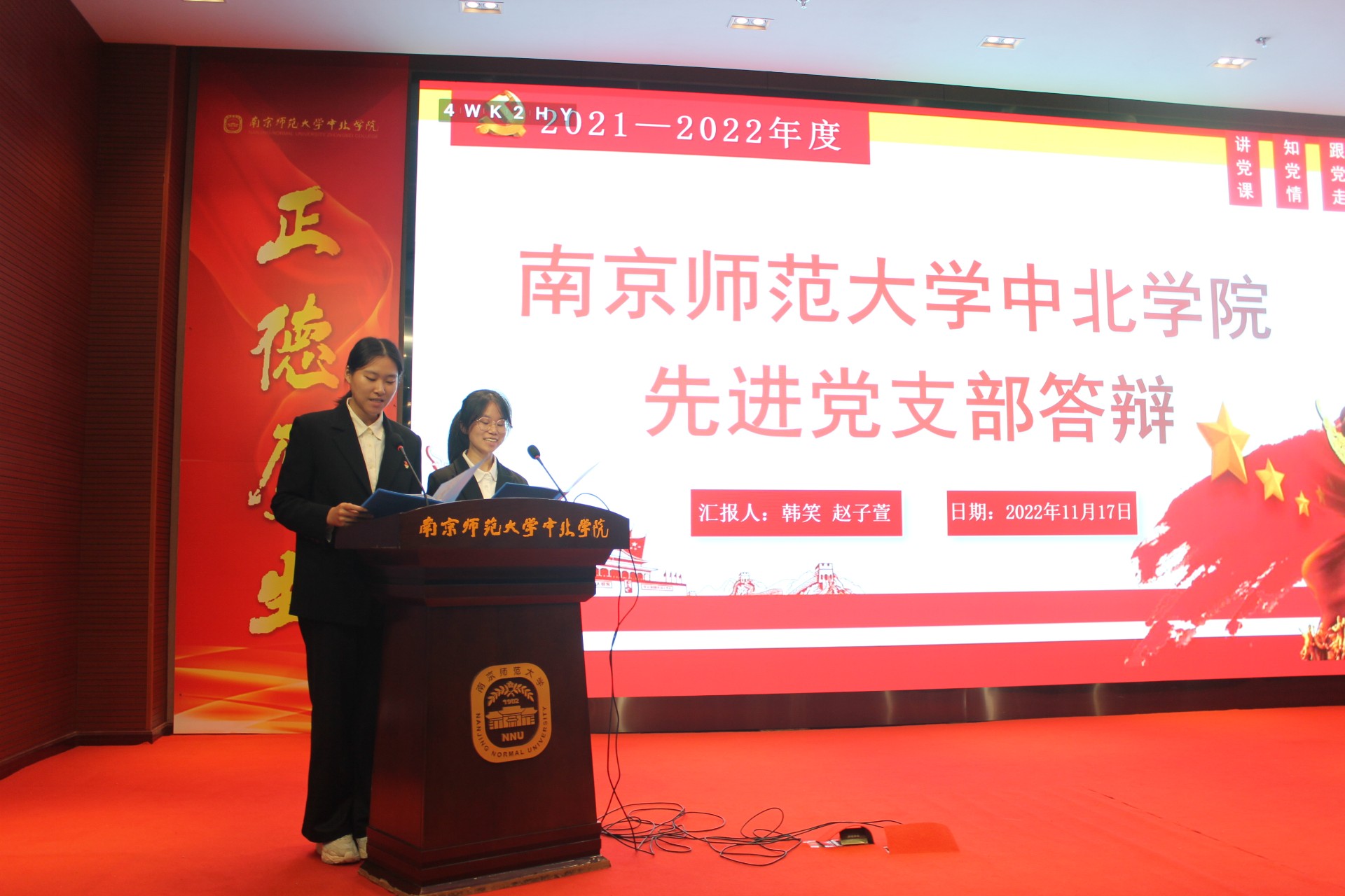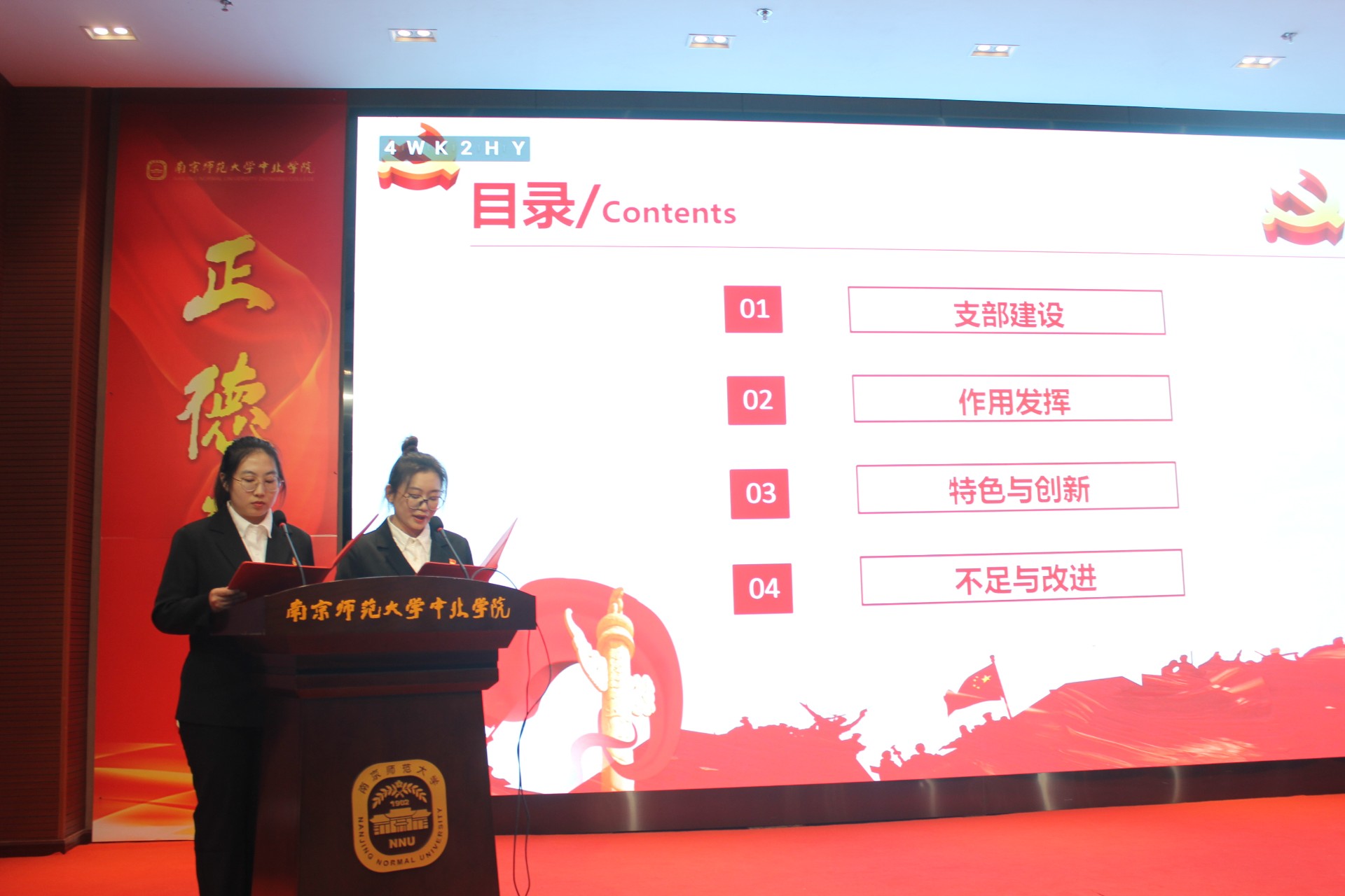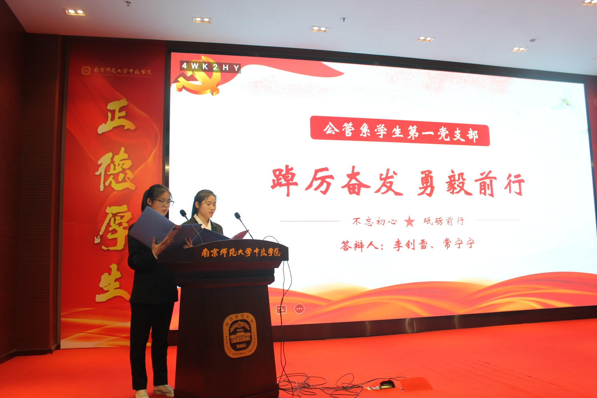 公管系从支部建设、志愿服务、支部特色、先锋模范四个方面进行汇报,展现了一年来公管系支部取得的一系列获奖成果。