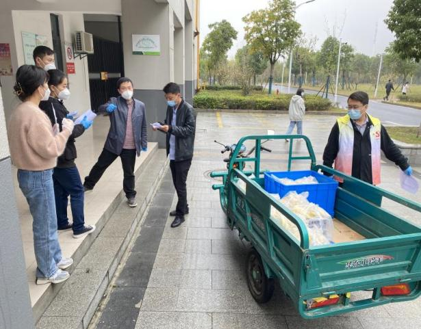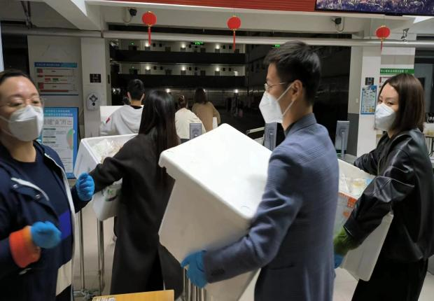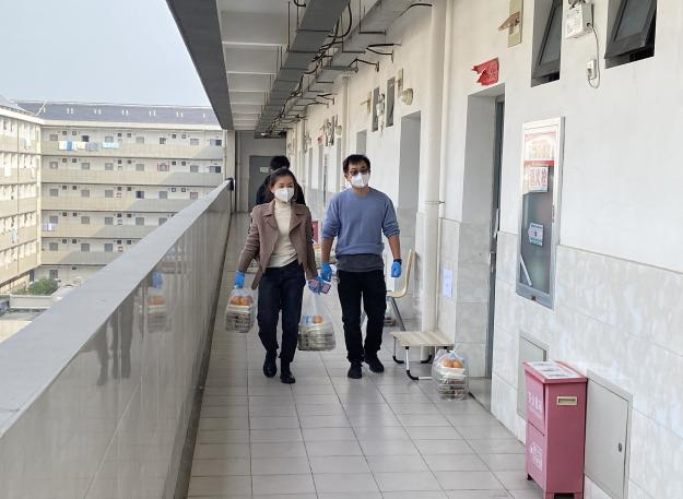 学生有头痛发热的症状,送诊专班开辟绿色通道,送诊志愿者老师随叫随到,直送医院,及时就医,让学生感受到了家人般的关心呵护。在健康观测的学生闭门不出,一日三餐需送餐上门。送餐专班的志愿者老师担负起了送餐重任。每天把需要送餐的人数统计清楚,把学生公寓楼栋、楼层、宿舍人员统计清楚,把定制好的快餐运到楼下。这些都不麻烦,辛苦的是把一袋袋包子、一包包豆汁、一盒盒饭菜送到每一个宿舍的门口。数以百计的饭盒,要在最短的时间送达。拎着饭盒,他们在楼层里跑上跑下,手拎疼了,脚跑麻了,气喘吁吁,他们没有一个人埋怨,没有一个人放弃。