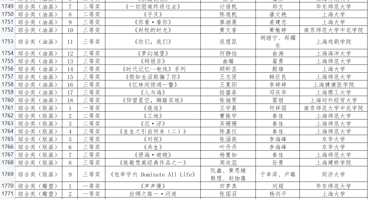 2022年第七届“汇创青春”上海大学生文化创意作品展示活动中,我校美术与设计学院学子在综合类多个组别的比赛中,与众多高校学生同台角逐,最终共2项作品获奖,其中由我院何祥国老师指导的872002班王宇晨同学《疫途》作品获得版画类一等奖,872003班黄文誉同学《封校的时光》作品获得油画类三等奖