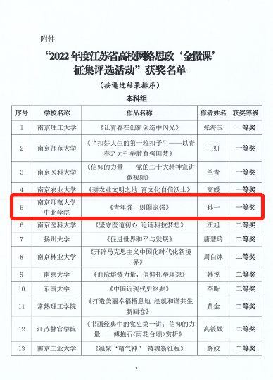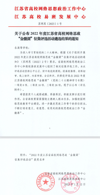 近日,江苏省高校网络思想政治工作中心和高校易班发展中心公布了2022年度江苏省高校网络思政“金微课”征集评选结果,我校孙一老师的作品《青年强,则国家强》在全省众多高校推荐作品中脱颖而出,荣获一等奖。