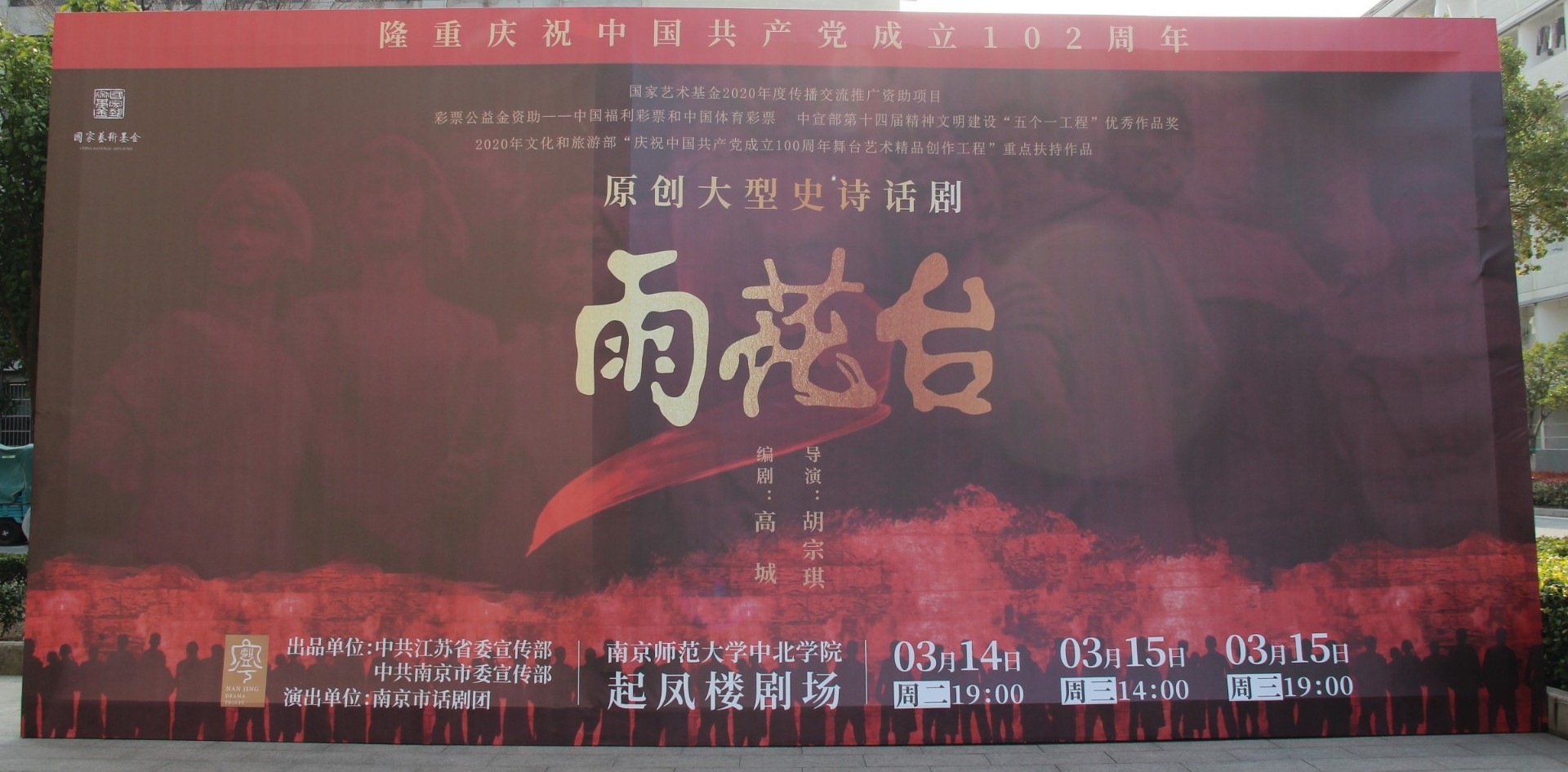 话剧《雨花台》是南京市话剧团为了“国家革命烈士纪念日”而创作演出的一台大型原创史诗话剧。讲述了雨花台就义的烈士们为了信仰,在面临生死抉择的时候,体现出来的信仰力量和人性光辉。两个小时的演出,以三个审讯室为主要场景。在暗无天日的监狱中,恽代英、冷少农、许包野、施滉等烈士,面对敌人的威逼利诱,坚守内心信仰,顽强不屈,彰显了信仰的力量。