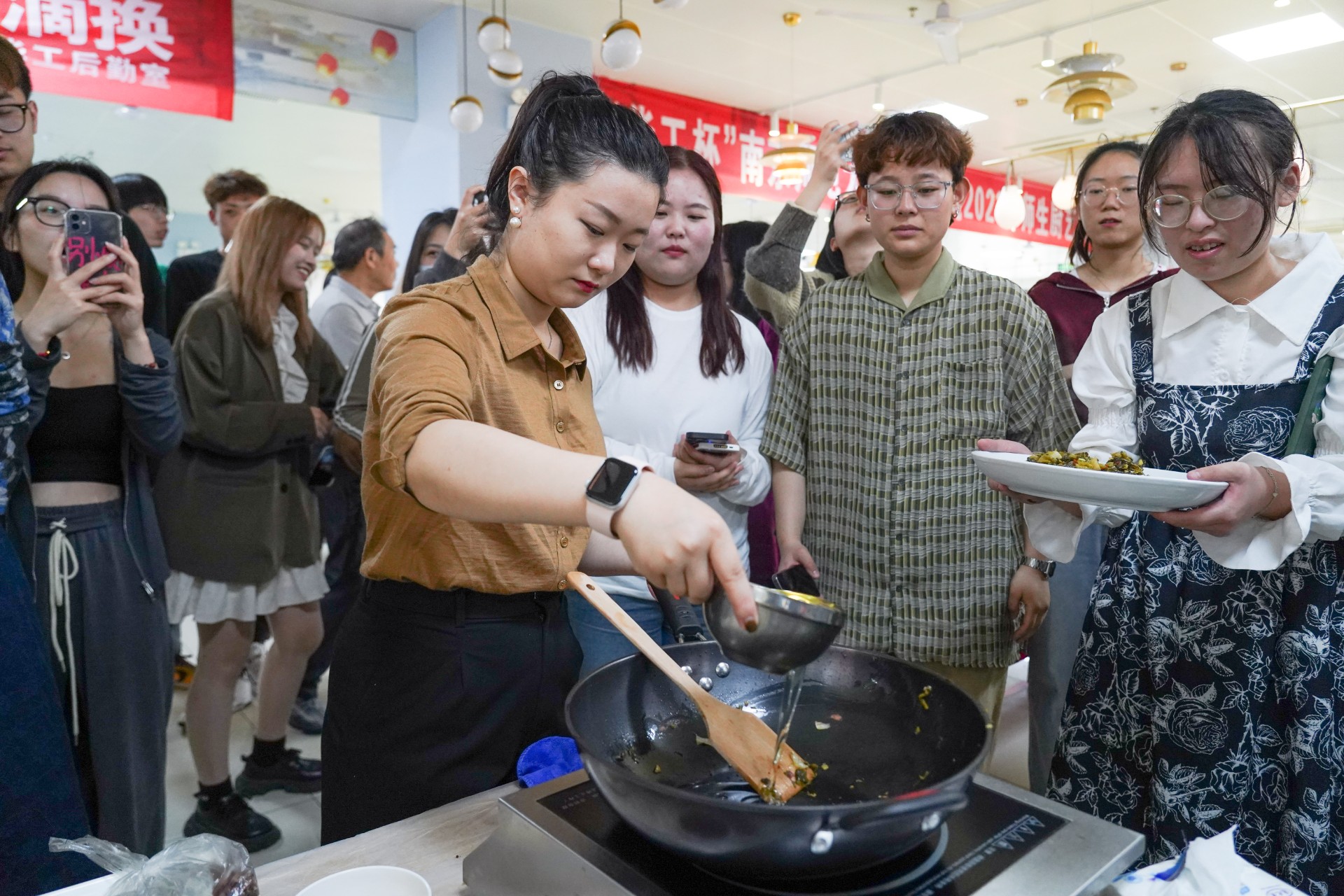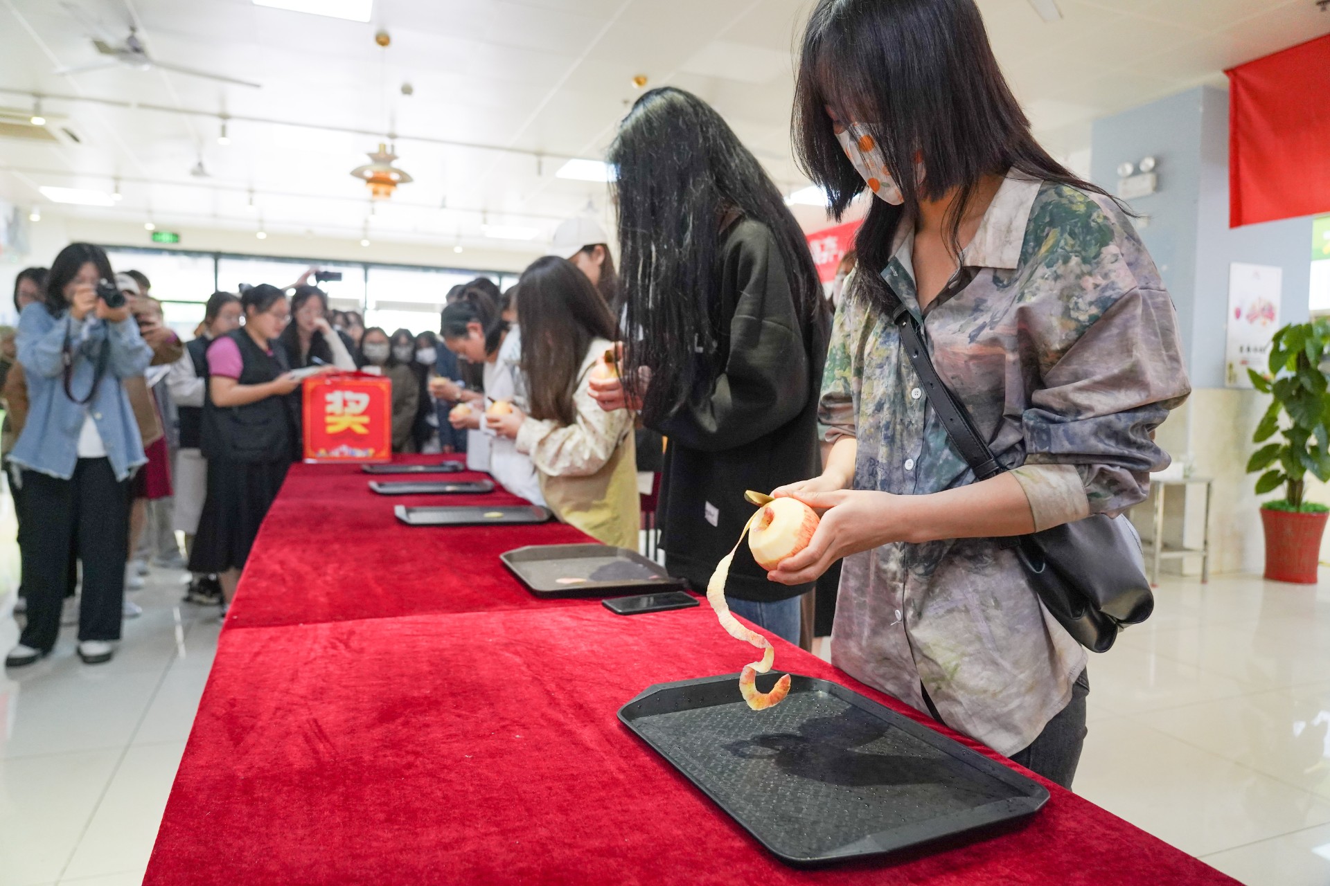 师生厨艺大赛井然有序进行的同时,一场“削苹果”游戏吸引了大家的目光,参与同学屏气凝神,专注于手上愈长的果皮。小游戏不仅为美食大赛的菜肴制作提供了充裕的时间,还有效锻炼了学生的劳动技能,充分调动起活动现场的热情氛围。