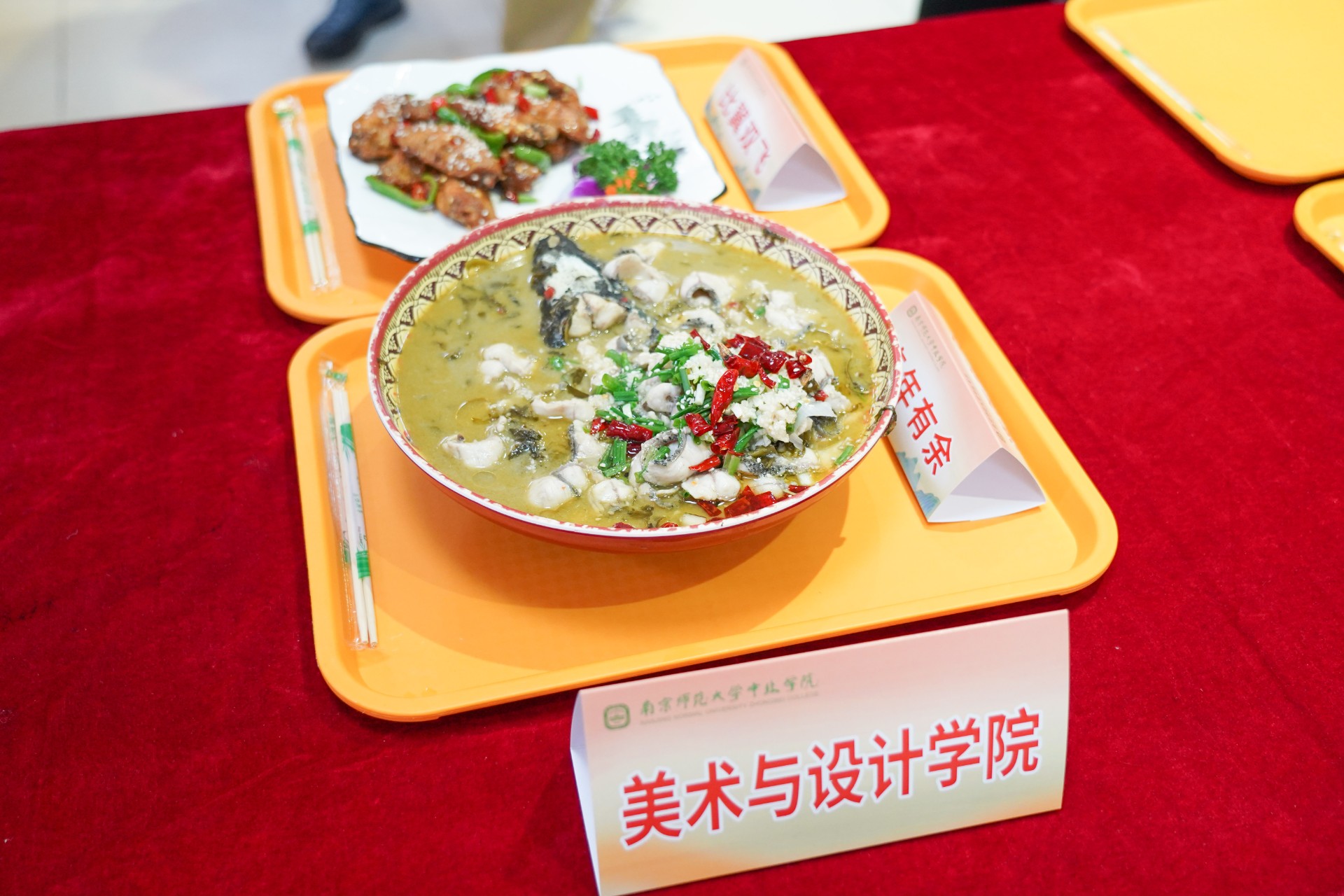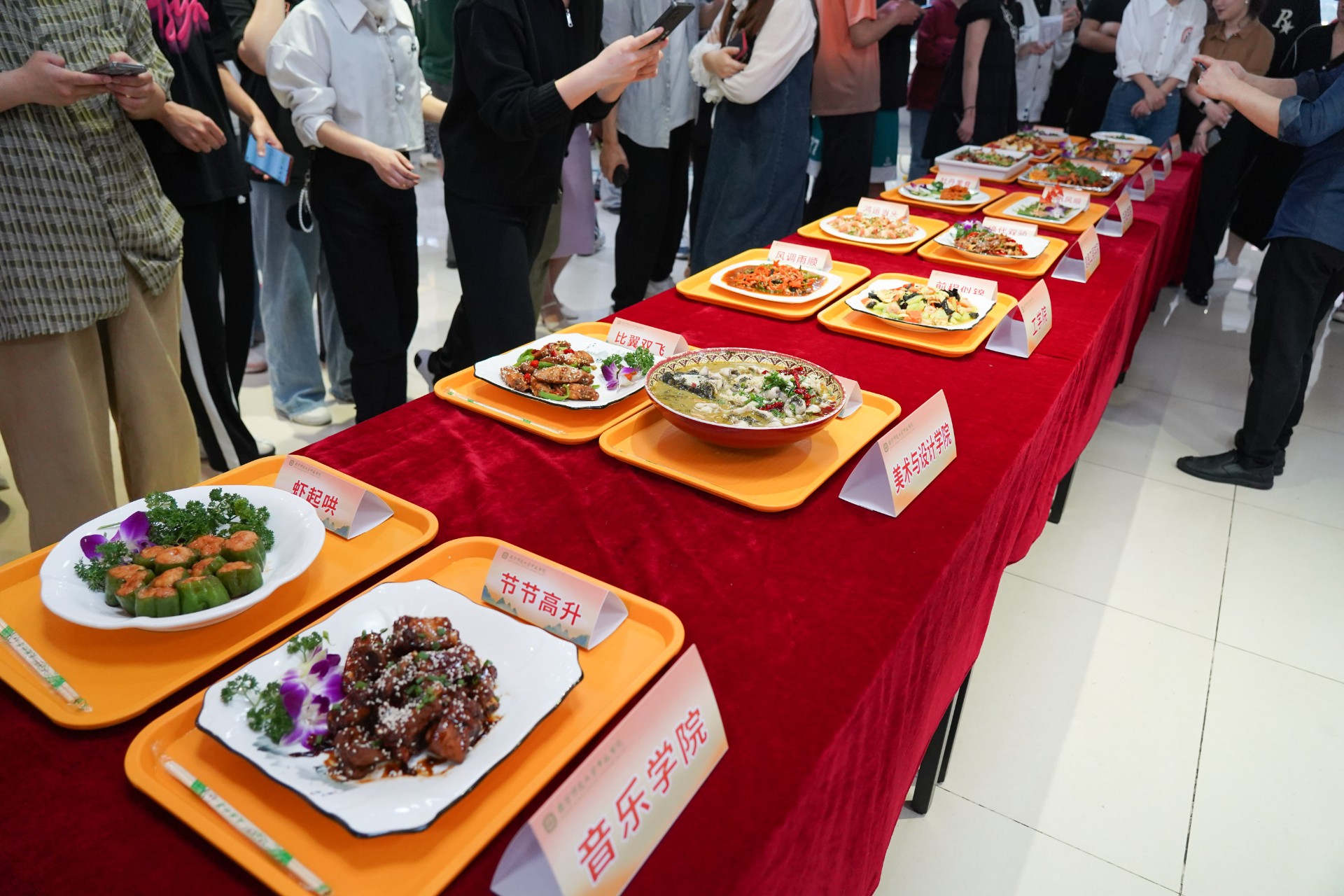 随着游戏落下帷幕,来自八个不同学院的参赛小组也陆续完成了美食的制作。有来自人文学院的“春色满园”“青云之志”,外国语学院“金玉良缘”“罗曼蒂克”,商学院的“年年富余”“慢火聚宝盆”,法政学院“牡丹里脊”“一帆风顺”,信息工程学院的“绝代双骄”“鸿运当头”、工学院 “前程似锦”“风调雨顺”,美术与设计学院“连年有余”“比翼双飞”,音乐学院“节节高升”“虾起哄”16道特色菜品。