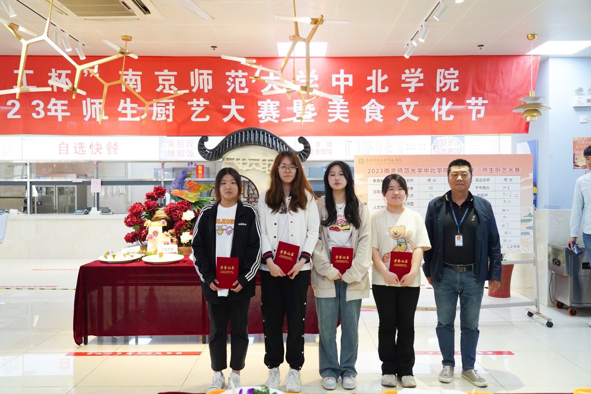 为丰富我校师生校园生活,展示师生协作能力,倡导师生健康生活,我校于2023年4月19日下午在北苑第四食堂举办“华工杯”2023年师生厨艺大赛。副院长夏宏全、丹阳市市场监管局曲阿分局周彦科长、后勤与保卫处处长肖安阳、学工处处长陈伟、工会副主席孙海棠、武汉华工南京分公司总经理任旺、人文学院党总支副书记刘钱凤出席本次活动并担任评委。