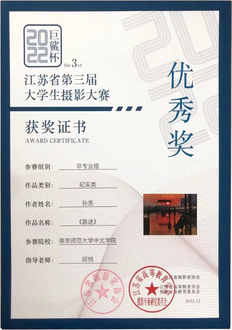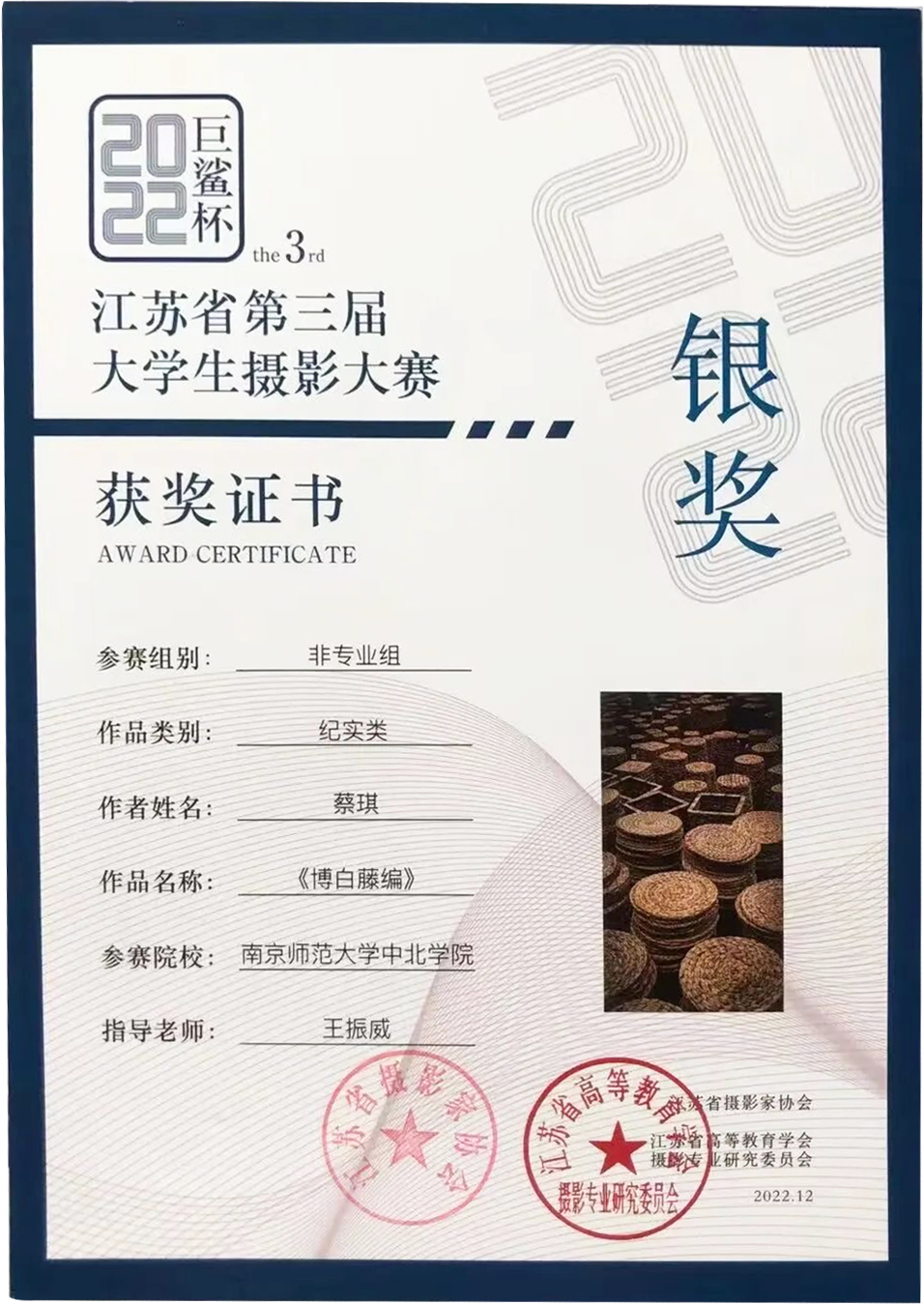 近日,2022年江苏省第三届大学生摄影大赛落下帷幕。来自全省47所高校的13705件作品展开激烈角逐,经过专家评审,最终人文学院蔡琪同学作品《博白藤编》获银奖,工学院孙思同学作品《路途》获优秀奖,我校在此次大赛中荣获“最佳组织院校奖”。