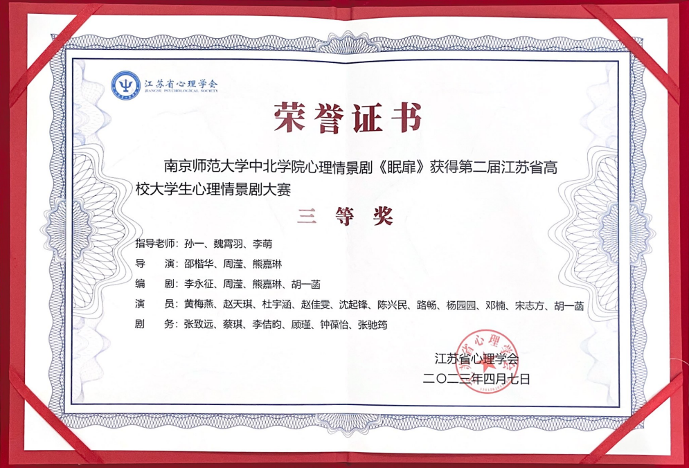 近日,由江苏省心理学会主办的“青春阳光,温暖携行”江苏省第二届高校心理情景剧大赛圆满结束。此次情景剧大赛得到省内各高校积极响应,共125件作品参加比拼。经专家组初审和复审,我校选送的参赛作品《眠扉》在众多作品中脱颖而出,取得了全省前20强的好成绩,在全省独立学院中排名第一,荣获全省三等奖。