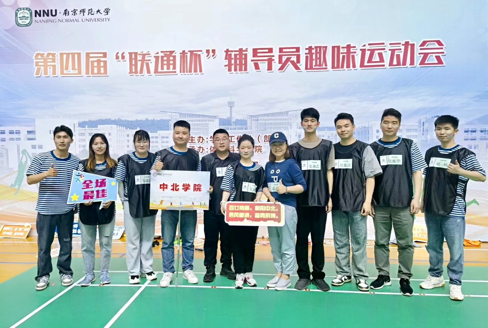 5月17日下午,南京师范大学第四届辅导员趣味运会在仙林校区体育中心举行。我校派出10人参加比赛。热烈的开幕式后,来自南师大各学院的300多名辅导员老师迅速投身项目角逐,本次运动会设置了运转乾坤、齐心协力、脚踏实地、妙手偶得等4个集体项目,以及7项个人项目。经过激烈的比拼,在所有参赛的29支代表队中,我校辅导员代表队表现突出,最终勇夺团体项目总成绩第一名!