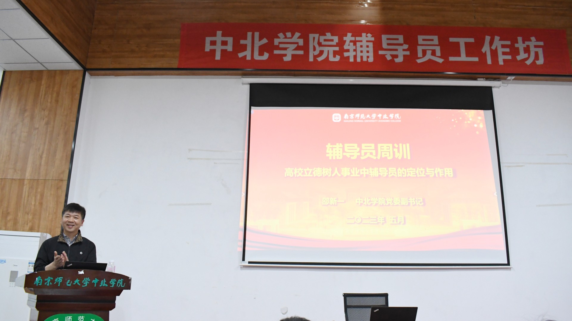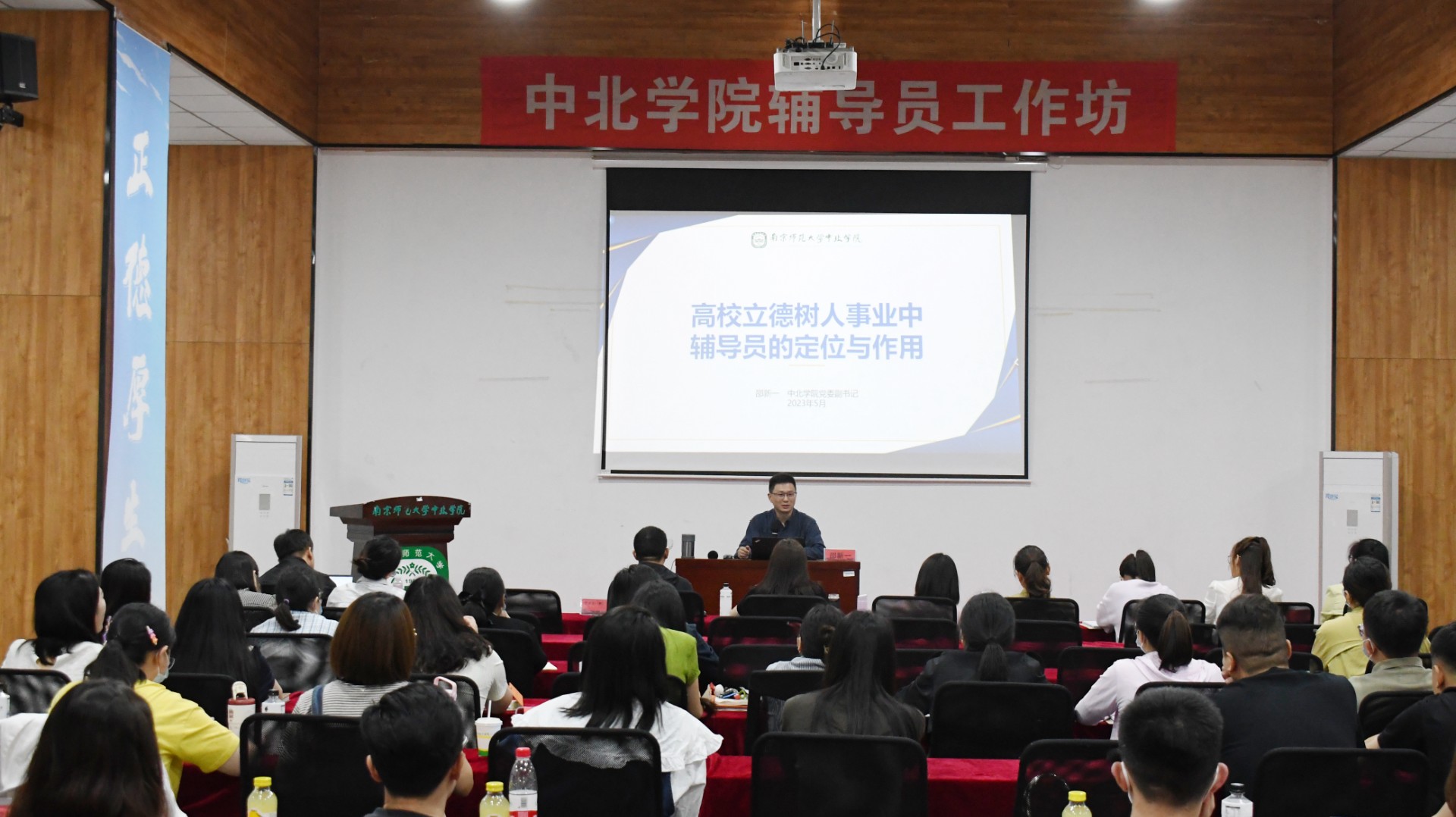 邵新一以《高校立德树人事业中辅导员的定位与作用》为主题,用了近两个小时的时间,从立德树人根本任务的理论依据、辅导员的角色定位与作用、中北学院学生工作的机遇与挑战等三个维度入手,结合当前的形势及学校的实际,进行了理论辅导、案例分析和经验分享,全方位、多维度、广视角对辅导员的工作实务和自身成长都给予了具体的指导,寄语全体辅导员要理清实情近况、制定实质方案、推动实干巧干、处置实时反馈、取得实效传承,争做学生学涯及时雨和学生生涯高被引。
