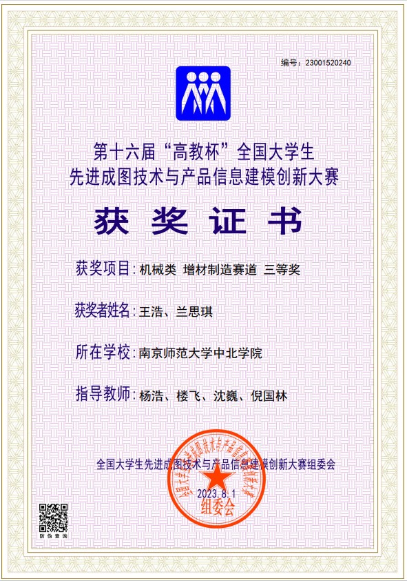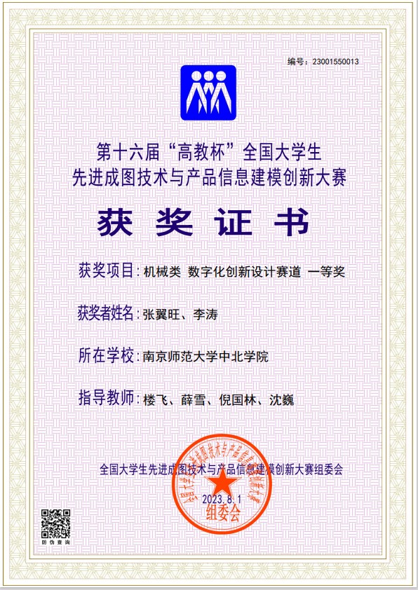 2023年7月31日,第十六届“高教杯”全国大学生先进成图技术与产品信息建模创新大赛全国总决赛在重庆交通大学圆满落幕。经过校赛、省赛的层层选拔,来自全国740余所高校的1188支参赛队伍齐聚山城,展开激烈的角逐。ky.com工学院代表队依靠沉着冷静的发挥斩获全国团体二等奖,各个赛道共获得一等奖1项、二等奖2项、三等奖4项。其中数字化创新设计赛道荣获一等奖,在全国各高校参赛队中排名第13名(江苏省第1名);增材制造赛道荣获三等奖(历年首次获奖);先进成图技术赛道张翼旺、李涛同学荣获个人二等奖,樊叶姿、兰思琪、王浩同学荣获个人三等奖;同时楼飞、沈巍等5名老师荣获优秀指导教师二等奖。