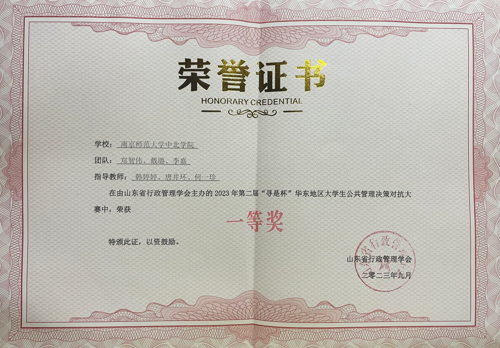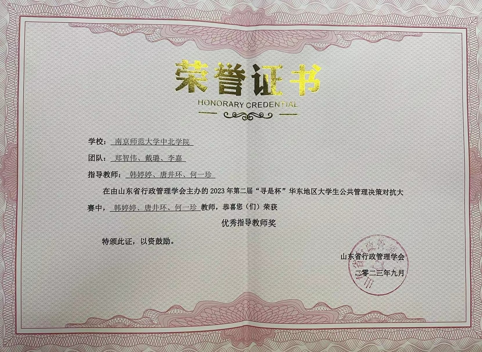 2023年9月23日至24日,第二届“寻是杯”华东地区大学生公共管理决策对抗大赛在齐鲁工业大学举办。我校法政学院行政管理专业韩婷婷老师、唐井环老师、何一珍老师指导2021级本科生郑智伟、戴璐、李嘉三位同学取得了华东地区一等奖的荣誉,三位指导老师荣获“优秀指导教师奖”。