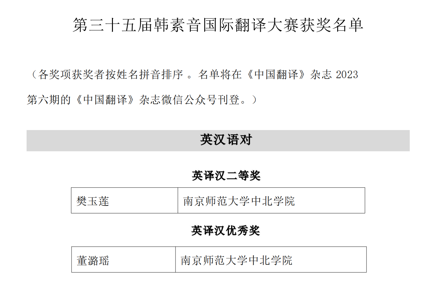 2023年10月17日,第三十五届韩素音国际翻译大赛获奖名单揭晓,我校外国语学院2021级翻译专业樊玉莲获英译汉组二等奖,2022级英语专业董潞瑶获英译汉组优秀奖。
