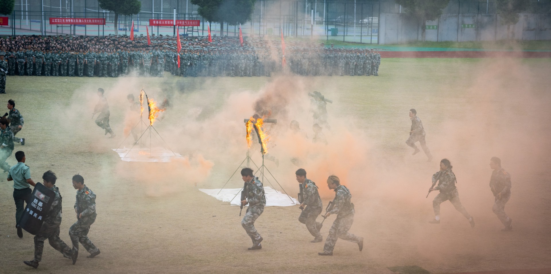 如果说盾牌操和军体拳表演是力量与美的展现,那么战术演练则是智慧与勇气的碰撞。同学们在各自阵营前穿戴好装备,迅速进入战斗状态。他们矫健、敏捷的身影不断穿梭在训练场上,展示着立姿、跪姿、卧姿出枪等战术动作。在模拟的战斗中,他们凭借着高超的战术素养和顽强的战斗意志,成功压制了“歹徒”,赢得了现场观众的阵阵掌声。