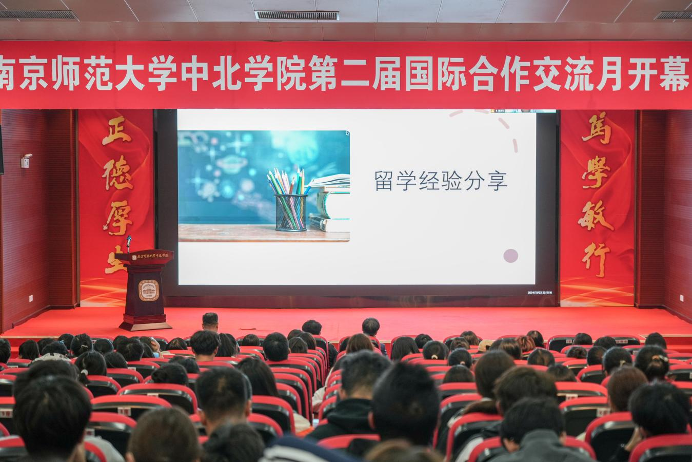 为进一步推进我校国际化办学进程,深化国际交流合作,满足学生多元化发展需求,拓展国际视野,增强全球竞争力,助力学生在未来职业生涯中脱颖而出,10月23日下午,我校第二届国际合作交流月开幕式在图书馆报告厅举行。北京新东方前途出国咨询有限公司南京分公司市场总监杨辉、中北学院教学顾问钟文辉、学工处处长陈伟等相关负责同志参加了开幕式。开幕式由教务处处长朱安友主持。