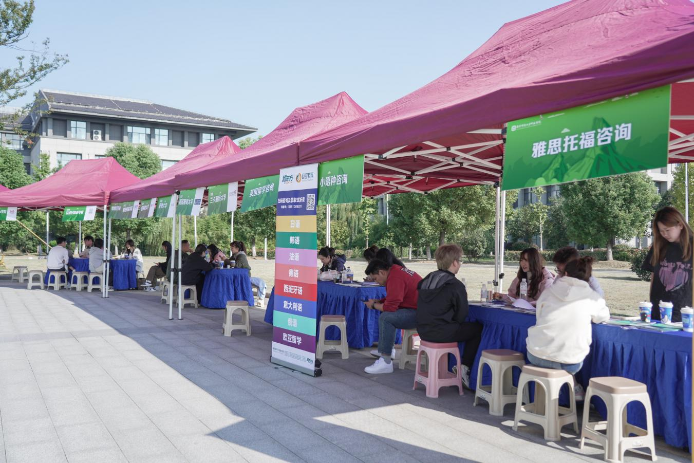 10月23日上午10点开始,图书馆广场同时举行了海外院校户外咨询展,澳大利亚蒙纳士大学、澳大利亚昆士兰大学、英国格拉斯哥大学、英国伯明翰大学及澳大利亚悉尼科技大学等12所海外优质院校校方代表与同学们零距离接触。各高校代表耐心细致地为学生解答了关于招生要求和留学政策等方面的问题。活动当天共有百余名同学前来咨询,现场气氛热烈。