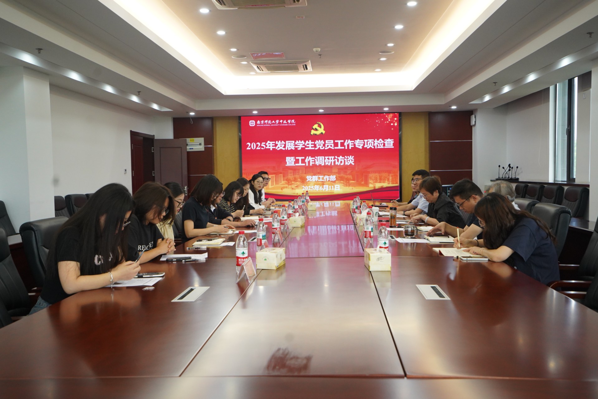 为进一步规范发展党员工作,严格发展党员程序,提高发展党员质量,全面提升基层党组织建设,6月11日上午,我校召开发展学生党员工作专项检查暨调研访谈会。南京师范大学党建指导员沈勇、中北学院党委书记周燕、副书记邵新一、党群工作部组织员以及9个二级学院学生党支部书记、学生党员代表、入党积极分子代表参加了调研访谈会,会议由党群工作部部长郝臻威主持。