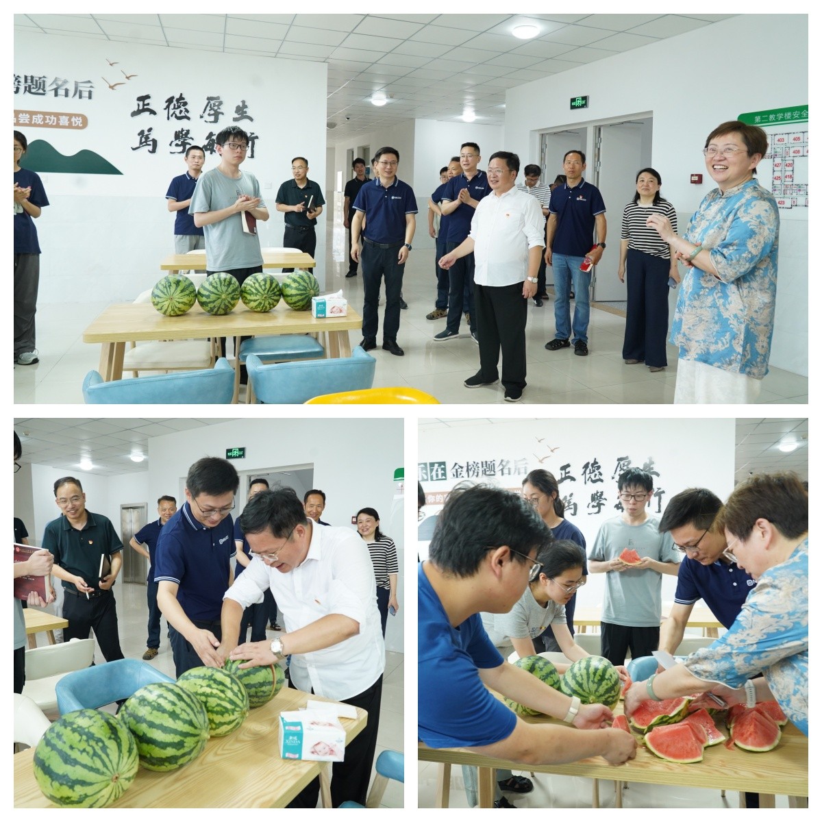 在敏学楼四楼大厅校领导看望了暑期留校备考今年研究生入学考试的同学,校领导为备考的同学们送上西瓜,表达对同学们的关心与鼓励。