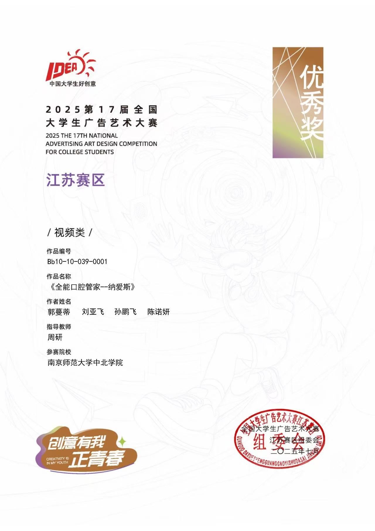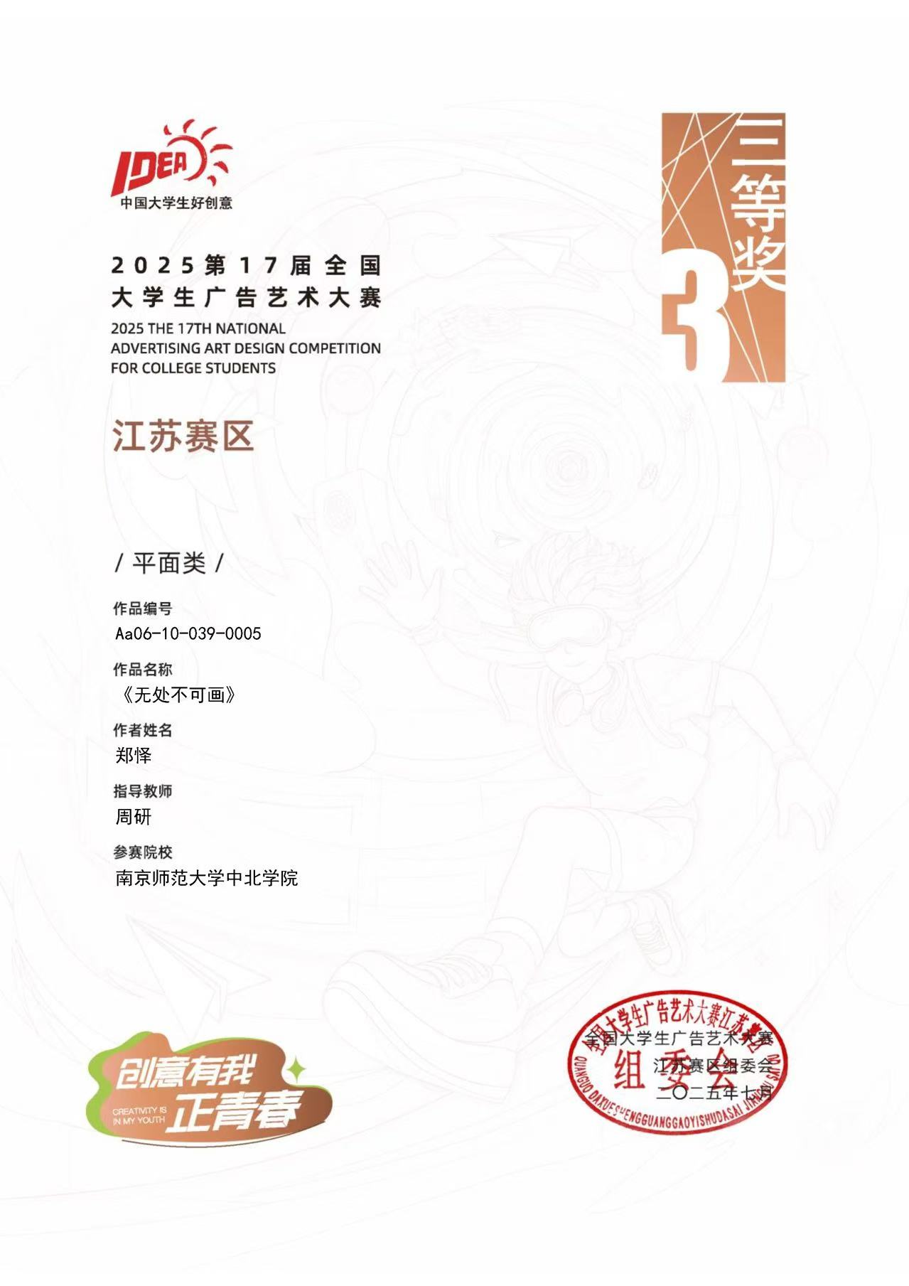 获奖作品中,郑怿同学的《无处不可画》(指导老师:周研)斩获三等奖,作品以独特艺术视角解锁创意设计的无限可能,尽显青年学子的思维活力;徐静宜、张怡琪等5位同学合作的《以时光之名,赴东方之美》(指导老师:张锋铭),郭蔓蒂、刘亚飞等同学的《全能口腔管家——纳爱斯》(指导老师:周研),莘慧敏、马智超等同学的《恋爱胃险》(指导老师:周研)则同获优秀奖。这些作品或深耕传统文化的现代表达,或聚焦生活场景的实用创新,既体现了对社会热点的敏锐捕捉,更展现了专业扎实的艺术表现力。