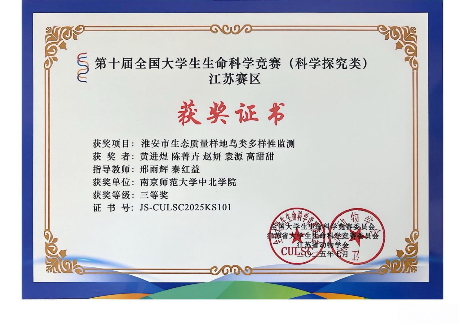 第十届全国大学生生命科学竞赛(科学探究类)江苏赛区决赛于2025年7月11日顺利收官。本届竞赛吸引了来自全省44所高校的1106个团队参与角逐,我院学生在此次竞赛中表现出色。由邢雨辉和秦红益两位老师指导,黄进煜、陈菁卉、赵妍、袁源、高甜甜五名同学共同完成的《淮安市生态质量样地鸟类多样性监测》项目,荣获江苏省三等奖,为学院争得了荣誉。