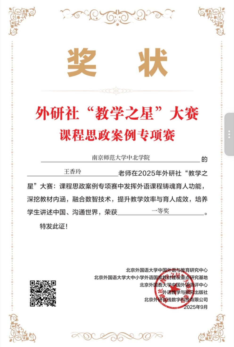 9月10日,由北京外国语大学中国外语与教育研究中心、外语教学与研究出版社等单位联合主办的2025年外研社"教学之星"大赛课程思政案例专项赛圆满落幕。我校外国语学院王香玲老师凭借其出色的课程思政教学设计与实践成果,在全国1636份比赛作品中脱颖而出,荣获一等奖!展现出我校在外语教学与思政育人融合领域的卓越成效。
