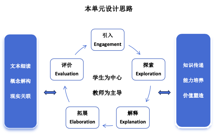 王香玲老师在本次比赛设计中以建构主义教学理论"5E 模型" (Engagement, Exploration, Explanation, Elaboration, Evaluation)为指导设计教案,深入挖掘教材中的思政元素,引导学生用外语讲好中国故事,增强文化自信,实现"沟通世界"的育人目标。