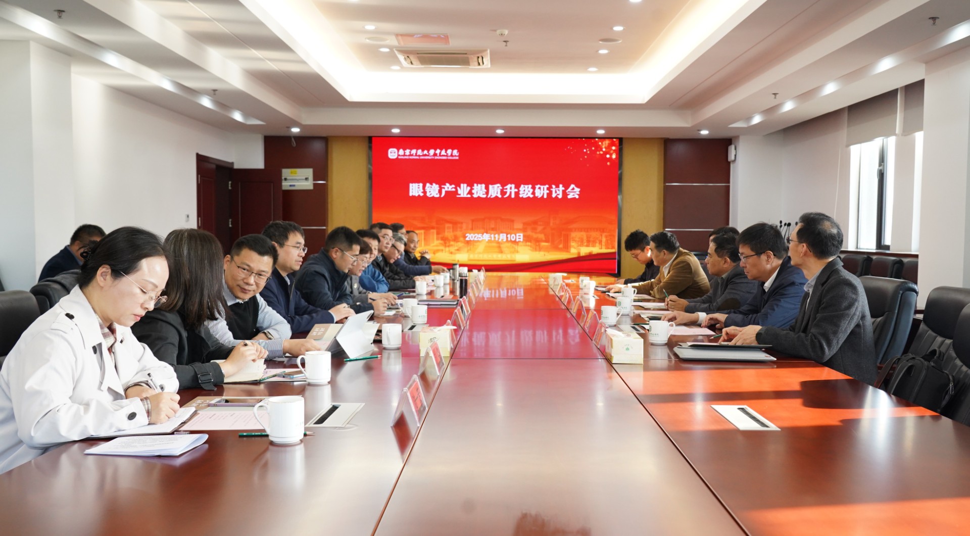 11月10日下午,一场旨在推动丹阳眼镜产业迈向智能化、高端化的研讨会在我校举行。东南大学首席教授、原常务副校长、石城实验室主任王保平,东南大学教授、原副校长丁辉,东南大学新型显示与视觉感知石城实验室主任顾问江汉,东南大学电子科学与工程学院教授、显示技术研究中心主任张宇宁,东南大学电子科学与工程学院副教授、物理电子系主任翁一士,东南大学总务处处长施畅等东南大学团队成员;丹阳市人民政府副市长张路率领的丹阳市眼镜产业链相关负责人,包括丹阳市经发局副局长吴东卫、丹阳市科技局副局长步坚平、丹阳市商务局党组成员方华、丹阳市市场监管局副局长陆一芳;丹阳市眼镜企业代表天禄眼镜公司董事长虞瑞泰、天禄眼镜公司总经理虞强、江苏鸿晨集团总经理张荭;我校党委书记周燕、生命科学与环境工程学院负责人钟文辉、科研与社会合作处处长顾中铸、党政办主任肖安阳参加研讨会。各方围绕人工智能融合、新型显示技术应用与产业人才培养等议题进行交流研讨。研讨会由党委书记周燕主持。