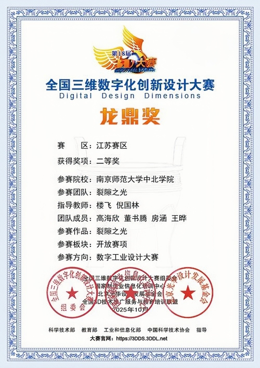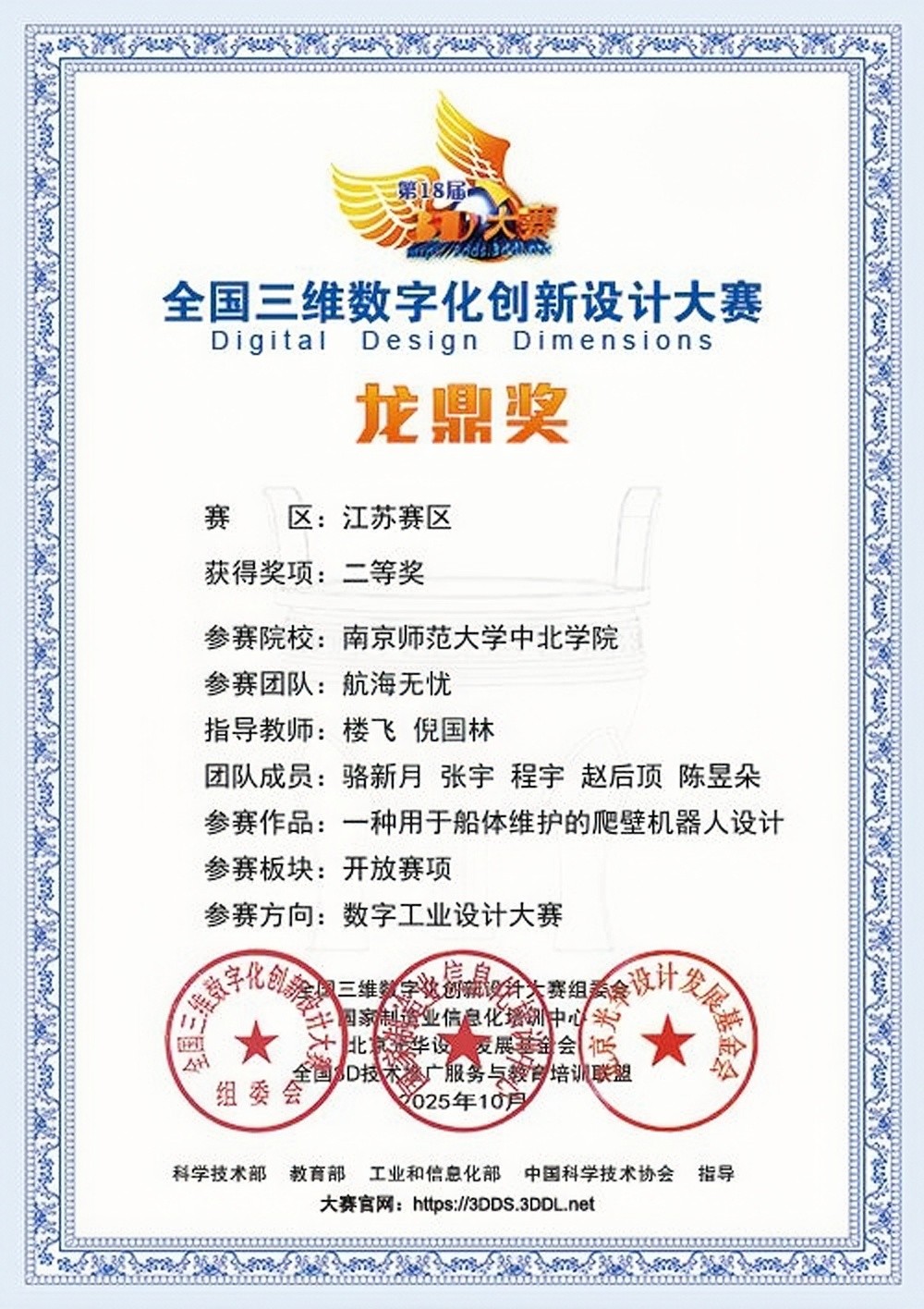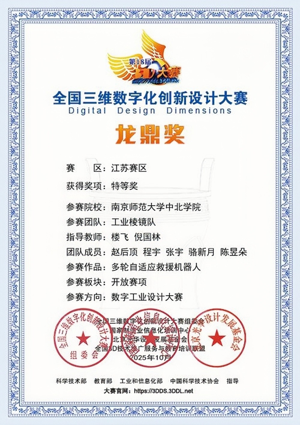 全国三维数字化创新设计大赛是由科学技术部、教育部、工业和信息化部、中国科学技术协会指导的国家级重要赛事,位列教育部学科竞赛榜单,该项赛事旨在推动三维数字化技术在各领域的创新应用,培养高素质创新型人才。